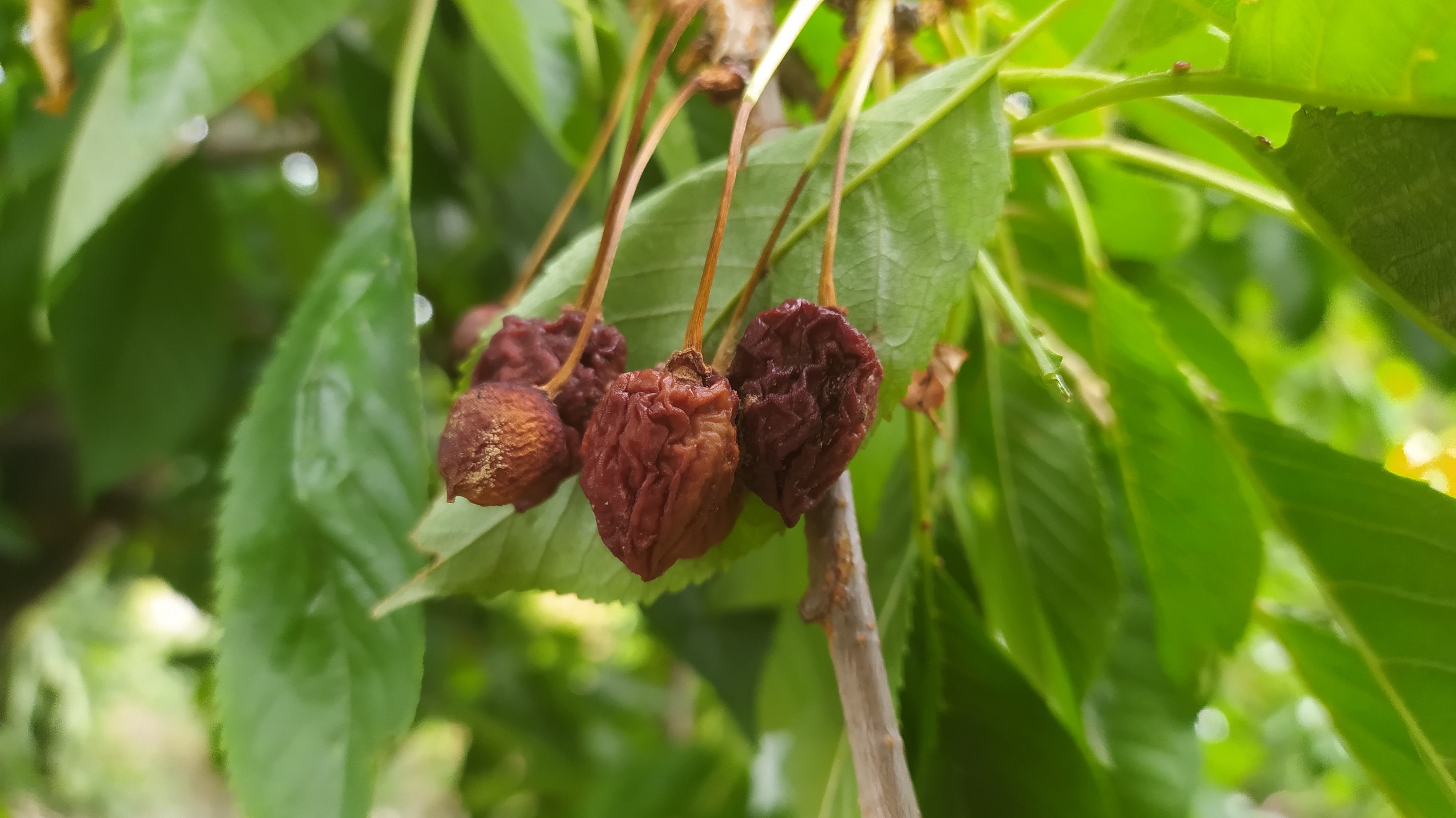 A rettegett monília tavaszi megjelenése során a gomba erőtlenségét tapasztalhattuk. A hajtásvégek elhalása, a virágos ágak barnulása, száradása az előző évieknél jóval kisebb mértéket mutatott. A későbbiekben a száraz, forró időszak nem kedvezett a kórokozónak, fentiekben jelzett tünetei sem fokozódtak. Az érés idején azonban a három gyakori moníliafaj közül a mintegy 15 éve nálunk is megjelent a M. fructicola a cseresznyefákon erős fertőzéssel lepett meg minden kertészkedőt. A késő tavaszi fagyokat átvészelt cseresznyefák szépen fejlődtek, a moníliás tünetek alacsony értékeket mutattak. A gyümölcsérés idején megfordult a helyzet. A termésen apró, drapp, puha foltokat láthattunk, helyenként közel 100 %- mértékben Azután a foltok gyorsan növekedtek és teljes érésben a szemek teljes felületére kiterjedt a drapp elszíneződés. A kedvezőtlen időjárás miatt a foltokon a penészpárnák egyelőre még nem jelentek meg. A jelentős mértékű fertőzés okát elsősorban abban látjuk, hogy az élelmezés-egészségügyi várakozási idők betartására ügyelő kertészkedők az általánosan előírt 14 napon túl sem permeteztek, hiszen a friss – akár a fa alatt állva csipegető – fogyasztás erre ösztönözte őket. A kórokozó viszont teljes energiáját bevetette.