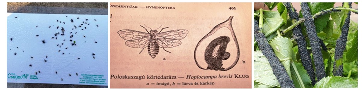 Két kollégám figyeli a poloskaszagú szilvadarázs rajzását is. Pályi Béla a keleti határnál 197 egyedet fogott az elmúlt héten a ragacsos fehérlapon. Az 1. képet is tőle kaptam. Ahol a kb.1 cm-es nagyságú, kirágott, ürülékes belsejű, poloskaszagú termések borították a fák alját, ott ez a rovar garázdálkodott. A szilvamoly később jelentkezik, még csak most kezdődött a rajzásuk, lásd a táblázatot. Ez a magot nem rágja meg, csupán a gyümölcshúsból táplálkozik. A poloskaszagú darázs egynemzedékes kártevő, a talaj felső rétegében telel, báb alakban. A szilva virágzása előtt bújik elő és egyenesen a virágkelyhekbe rakja a tojásait. Amennyiben kb. 2 mm-es, barnuló foltokat látnak a csészeleveleken, sziromhullás után minél gyorsabban egy felszívódó készítménnyel kell védekezni a kikelő lárvák ellen. Az acetamiprid hatóanyagú Mospilan 20 SG és a névváltozatai engedélyezettek ellene a felszívódó rovarölők közül. Méhkímélő készítmények, „méhekre nem jelöléskötelesek”. Kisebb fáknál ragacsos fehér lapok kihelyezésével gyéríthetjük a kártevők, amennyiben a lapokat már a virágzás előtt kiakasztjuk a fa ágaira, minden oldalra, minél nagyobb számban. Érdemes körülnézni az alábbi oldalon:http://www.csalomoncsapdak.hu/5kartevoklatinnevszerint/pdffajonkentik/hoplocampaflavaesminutaszilvadarazsak.pdf