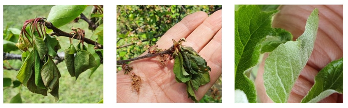 A8. felhívásban lefotóztam egy fertőzött almarügyből betegen kitörő lisztharmatos levélcsokrot. Ez volt az idei elsődleges (primer) fertőzés. Ezek a levélkék már továbbfertőzték az egészséges leveleket is. Ezt láthatják a 3. fényképen. Sziromhullás után a lisztharmat ellen is indítani lehet a felszívódó készítményekkel történő védekezést! Közülük jó néhány mindkét kórokozó ellen engedélyezett, bár pl. a Topas 100 EC-t inkább a lisztharmatra, míg a Score 250 EC-t inkább a varasodásra ajánlják. Tájékozódjanak a gazdaboltokban és olvassák el a címkék feliratait! Még néhány termék a bőséges kínálatból: Difcor, Domark 10 EC, Dagonis, Cyflamid (csak lisztharmatra), Qualy (csak varasodásra), Chorus 50 WG stb.