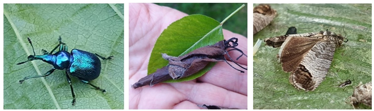 Inkább látványos, mint veszélyes a házikertekben a szivarsodró eszelény kártétele. Főleg szőlőn és körtén találkozhatunk a szivarszerűen összesodort levélcsomókkal.A talajban telelő bogár tavasszal rajzik ki és párosodás után a nőstények az összegöngyölt levelek belsejébe helyezik el a tojásaikat. A fészek biztonságában kifejlődő lárva egy idő után kirágja magát és a talajra pottyan. A felszín alatt bábozódik, egy nemzedékes, jövő tavasszal találkozunk velük újra. Tegnap szőlőn csíptem el a bogarat (1. kép) és a körtén találtam a tavalyi „szivart” (2. kép).