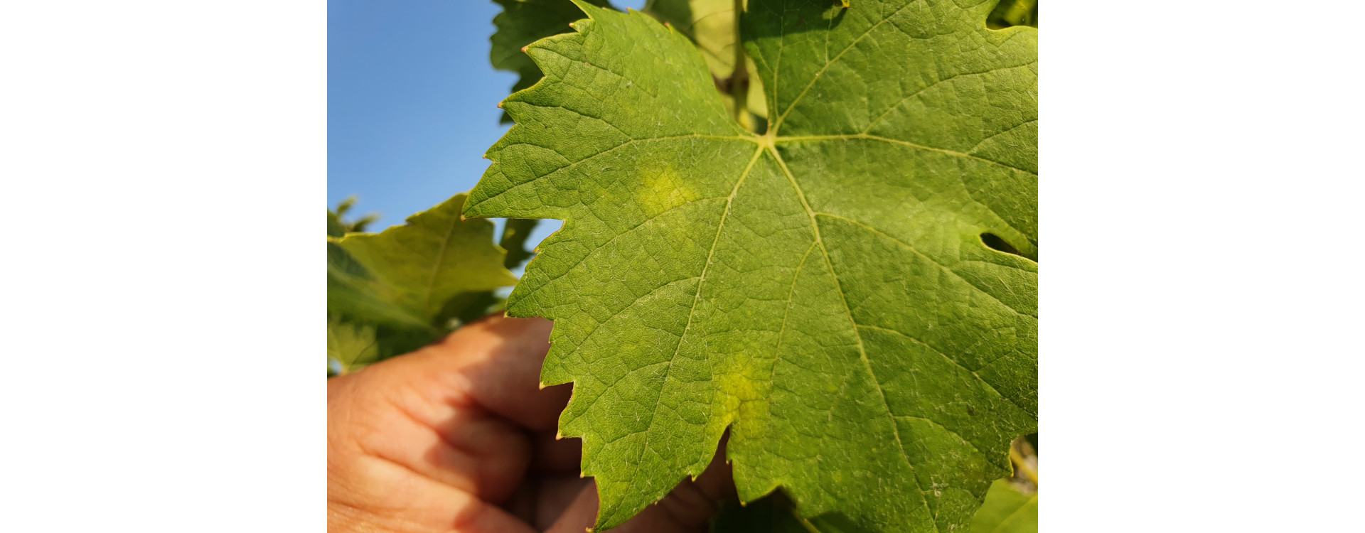 A peronoszpóra a szőlő bármely zöld részét megbetegítheti, a virágokat, a fiatal fürtöket, a hajtásokat, a kacsokat és a leveleket is. A megtámadott szőlősejtek zöld színteste is elbomlik, ettől keletkeznek a sárga zsíros foltok, az ún. olajfoltok a leveleken (Lásd a 2. fotót). Tehát ekkor már megtörtént a fertőzés és akár másnap megjelenhetnek a gomba telepei, a fehér penészgyepek, amelyek a fonákon a foltok alatt fejlődnek ki. Ezekről szóródnak a fertőzést tovább vivő spórák (konídiumok), amelyek mérsékelten meleg és erősen párás időjárásban expressz gyorsasággal beteríthetik az egész ültetvényt. A nyár vége felé leszáríthatja a leveleket, pedig ezeknek még cukrot kellene termelniük a fürtökbe. Alacsony lesz a mustfok! Eddig szerencsénk volt a fürtfertőzéssel, most a lombot kell megóvni. Sajnos váratlanul, a széllel is megkaphatjuk a könnyen repülő nyári spóráit. Ez a hirtelen érkező fertőzés is jelentős lehet, mindig résen kell lennünk.
