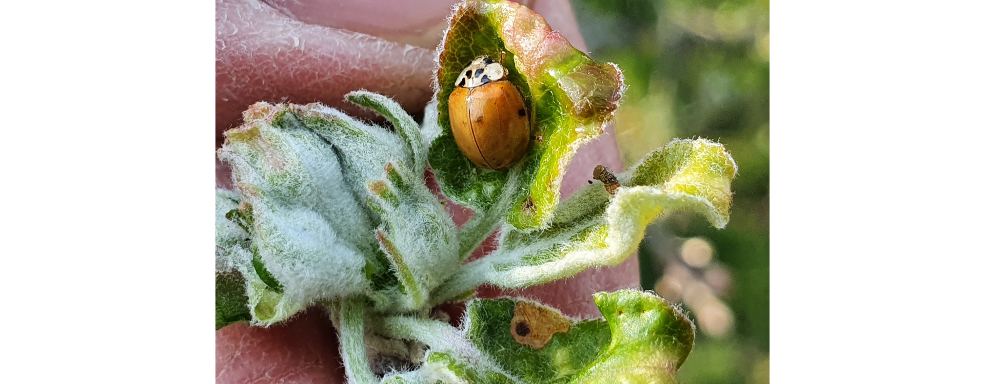 Mindeközben a károsítók is megérkeztek. A 3. képen az levélpirosító almalevéltetű kezdeti kárképét láthatják. Az éhes katica elől a bepöndörödött levélszél védelmében próbál elbújni a levéltetű. Ezt a fát még sohasem kellett permetezni ez ellen a levéltetűfaj ellen. Főleg a katicák segítettek ebben, nem engedték felszaporodni. Ahol mégis gondot okoznak a szívogatásukkal, ott almában a Kaiso Garden, a Karate 2,5 WG és a Zeon, a Klartan 24 EW (melyet korábban Mavrik 24 EW-nek hívtak), a Mospilan 20 SG, a Pirimor 50 WG, a Teppeki 50 WG engedélyezett. Gyérítésre alkalmas a Nanotac EC, amely a permetlécsepp beszáradása után egy polimer hálóba kötözi, ebbe fojtja a levéltetűt. A Vektafid A és a Vegarep EC olajat tartalmaznak, téli lemosásra és csökkentett koncentrációban, nyáron is használhatóak a levéltetvek ellen is. Válasszák a „kíméli a hasznos rovarokat” feliratú rovarölőket!