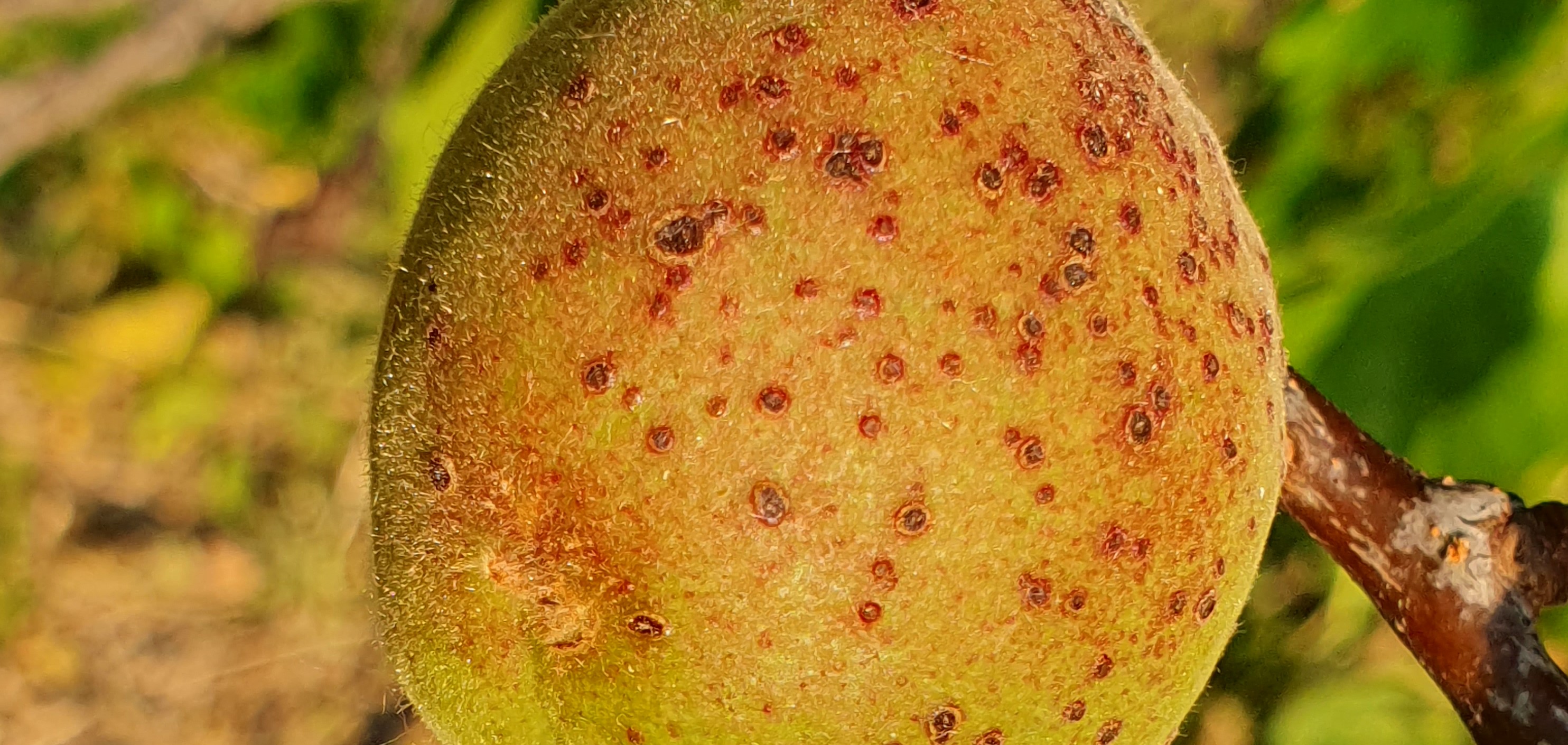 A kajszin 05.29-én már termésen fotóztam a levéllyukacsosodást okozó gombának, a sztigminának a tüneteit (5. kép), amelyre a 11. felhívás készítményei mellett a Chorus 50 WG és a Topas 100 EC is engedélyezett egyes csonthéjasoknál.