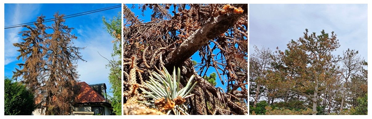 „Még tíz évet adok a tujáknak!” – hallottam néhány éve egy neves kertészprofesszortól. Úgy tűnik, hogy beigazolódott a jóslata. Barnuló tujasövények között sétálhatunk a parkokban, az utcákon. Egyre több a kopasz ezüstfenyő is (lásd a 2. fotót), és néhol az erdeifenyők sincsenek jobb állapotban. A 3. fénykép Hegyesden készült, kirándulás közben, erdőben, a fenyő természetes környezetében. Ott is pusztulnak! El kell fogadnunk, hogy az örökzöldek közül jó néhány faj nem bírja az egyre sivatagosabbá váló klímánkat. A kiszáradt faóriásokat pedig el kell engednünk, már nem tudjuk visszazöldíteni őket. Ne várjunk a kivágásukkal! A sekély gyökerű fenyőket könnyen kidöntik a mostanában gyakori viharok!