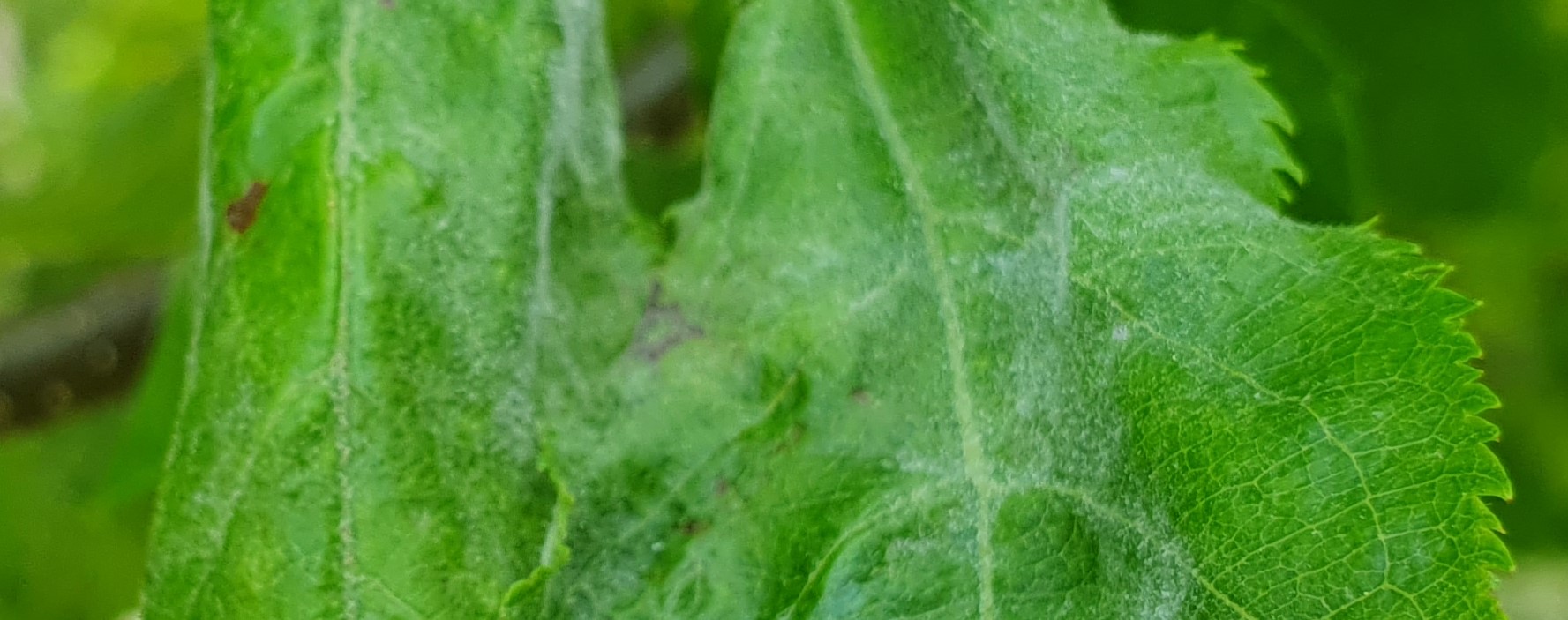 A 2. fotó május 2-án készült. Már az egészséges rügyekből, egészségesen kihajtott almaleveleken láthatják a lisztharmat telepeit. Ez már tehát a másodlagos (szekunder) fertőzés. A beteg, „rongyos” rügyekből „lisztesen” kibújt levélkék felületéről lefűződő spórák terjesztették tovább a betegséget. Ennél a fánál még nem védekeztek az idén, elmaradt a megelőző permetezés, beengedték a lisztharmatot a lombkoronába. Természetesen még fel lehet venni a harcot a gombával (5. felhívás), de biztosan többször kell majd permetezni, mintha már a metszéssel és a rügypattanáskori lemosással is védekeztek volna.