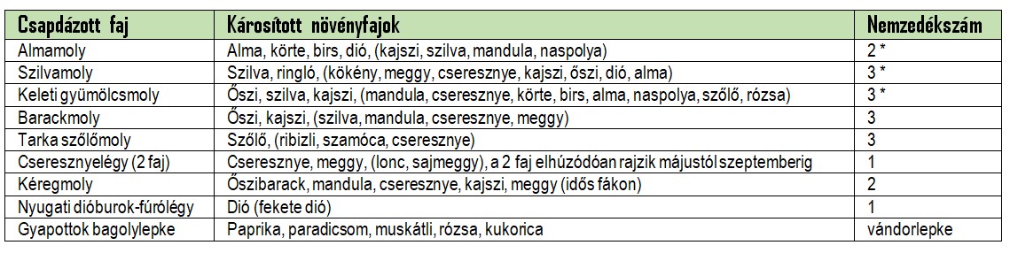 Felszereltük az előrejelző eszközeinket az országos hálózatunkba. A fogási adatokat folyamatosan frissített tájékoztatónkban tekinthetik meg. Idén a táblázatban szereplő kártevők mellett a kéregmoly, az amerikai szőlőkabóca és egy üvegházban a citrusmoly rajzását is nyomon követjük szín, illetve feromoncsapdákkal.