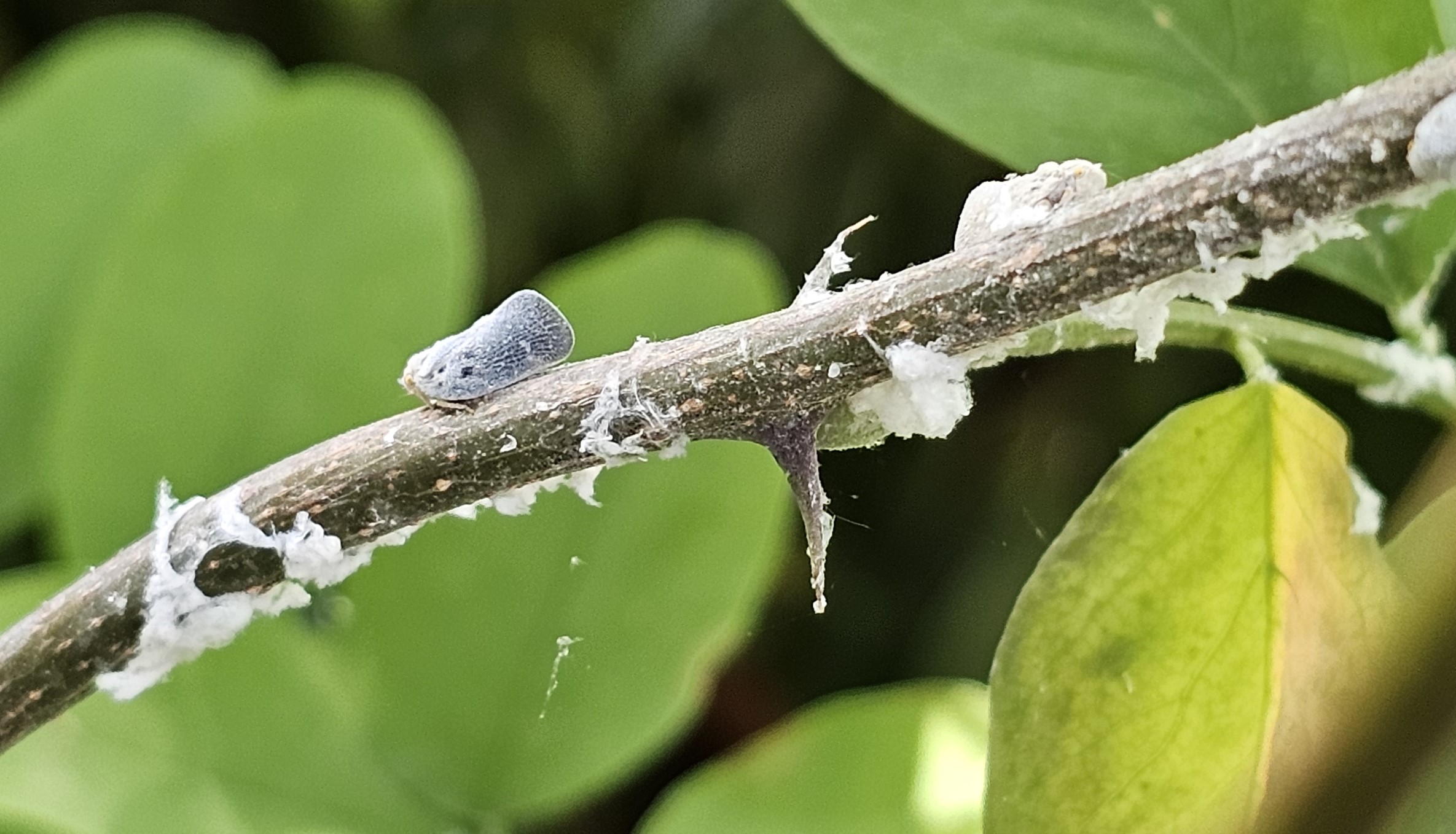 Talán az aszályos időjárás és a nálunk is terjedő parazitája (egy ollósdarázs faj) miatt csökkent le az utóbbi években az amerikai lepkekabócák egyedszáma. Újra megjelent! A fehér viaszszálas lárvatelepeit és a fürge lárvákat az idén már megtaláltam fagyalon, áljázminon, rózsán és július 8-án már az ivarérett, szaporodásra és terjedésre képes „lepkét” is lefotóztam akácon.