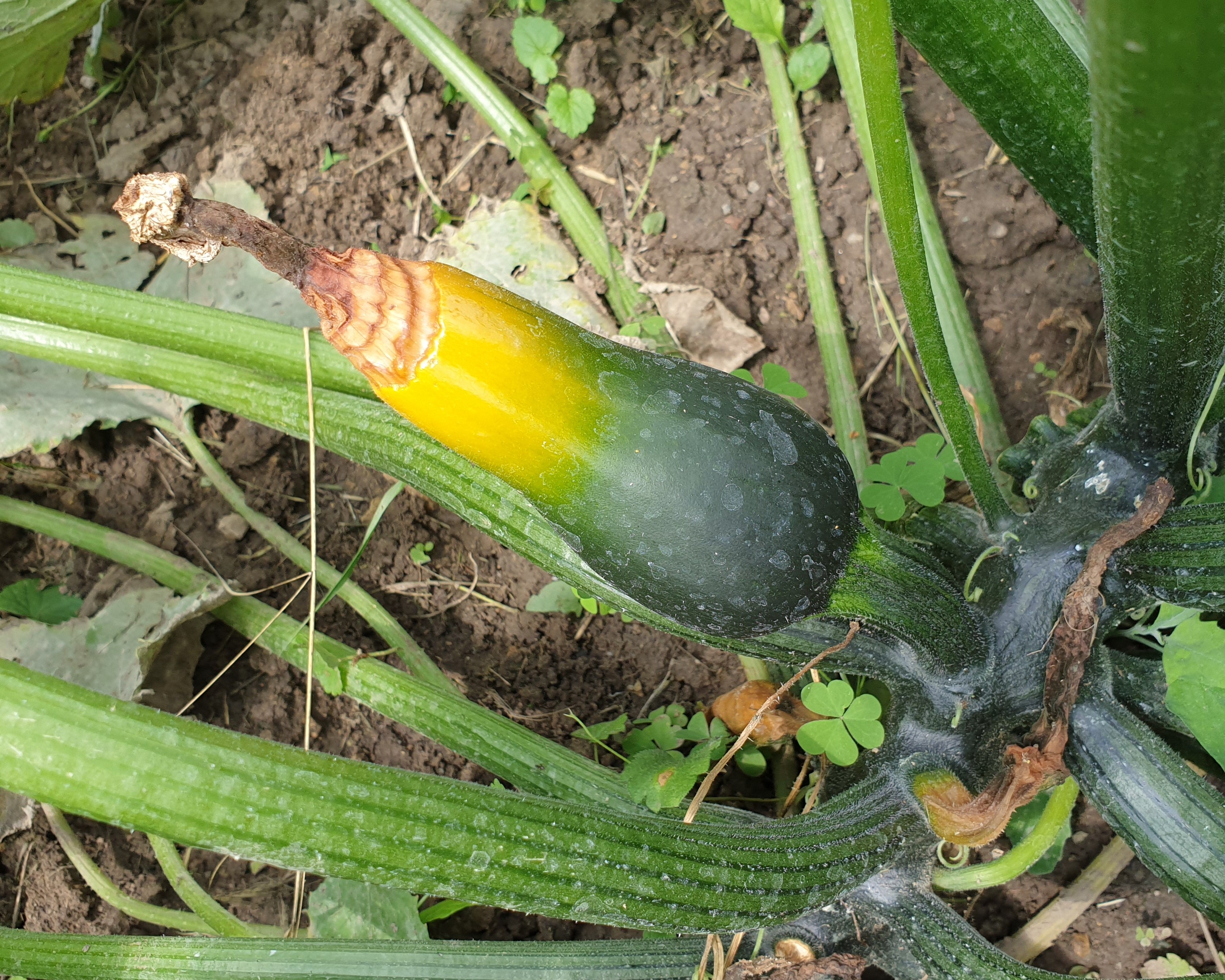 Nagy melegben és a hirtelen változó hőmérsékleten, vagy ha ingadozik a talaj és a levegő nedvessége, akkor a paradicsom, a paprika, de pl. a cukkini sem tudja felvenni a talajból a kalciumot. Hiánya csúcsrothadás (feketetalpasság) formájában jelentkezik a termés csúcsi részén. Még lehet pótolni, olyan lombtrágyákkal, melyek szerves kötésben tartalmazzák a kalciumot. Ilyen pl. a Wuxal kalcium, a Damisol Kalcium vagy a Fitohorm Kalcium. A szüretig többször ismételhetik a permetezést, az almánál is, ahol a tároláskori foltosságot előzhetik meg ezekkel a kezelésekkel. A cukkini szépen terem az idén. Öt éve fotóztam a kalciumhiány miatt rothadó végű termést.