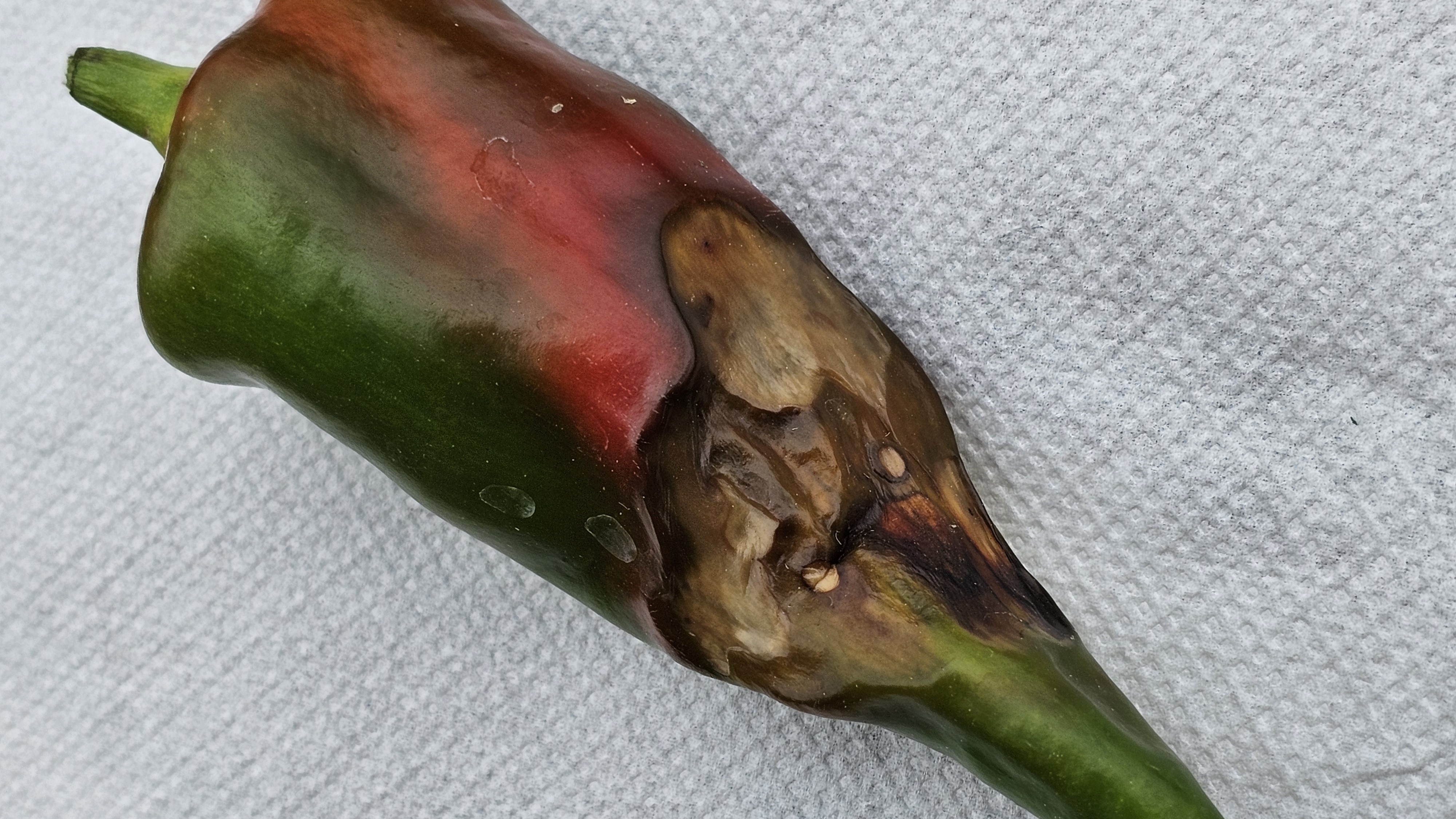 A varasodás, a peronoszpóra és a fitoftóra, de a csonthéjasok levélbetegségei sem robbantak be. A páramentes szárazság (légköri aszály) a lisztharmat gyors terjedését is gátolta. De nem tűnt el, csak csendben várakozik a jobb időkre, a többi kórokozóval együtt… Jelenleg az öntözés és az UV sugárzás elleni védelem a legfontosabb teendő a kertekben és a parkokban is. Cigány Zoltán július17-én fotózta Esztergomban a Nap perzselte fiatal kőrisfát. Nyitóképünkön napégett paprikatermés látható.