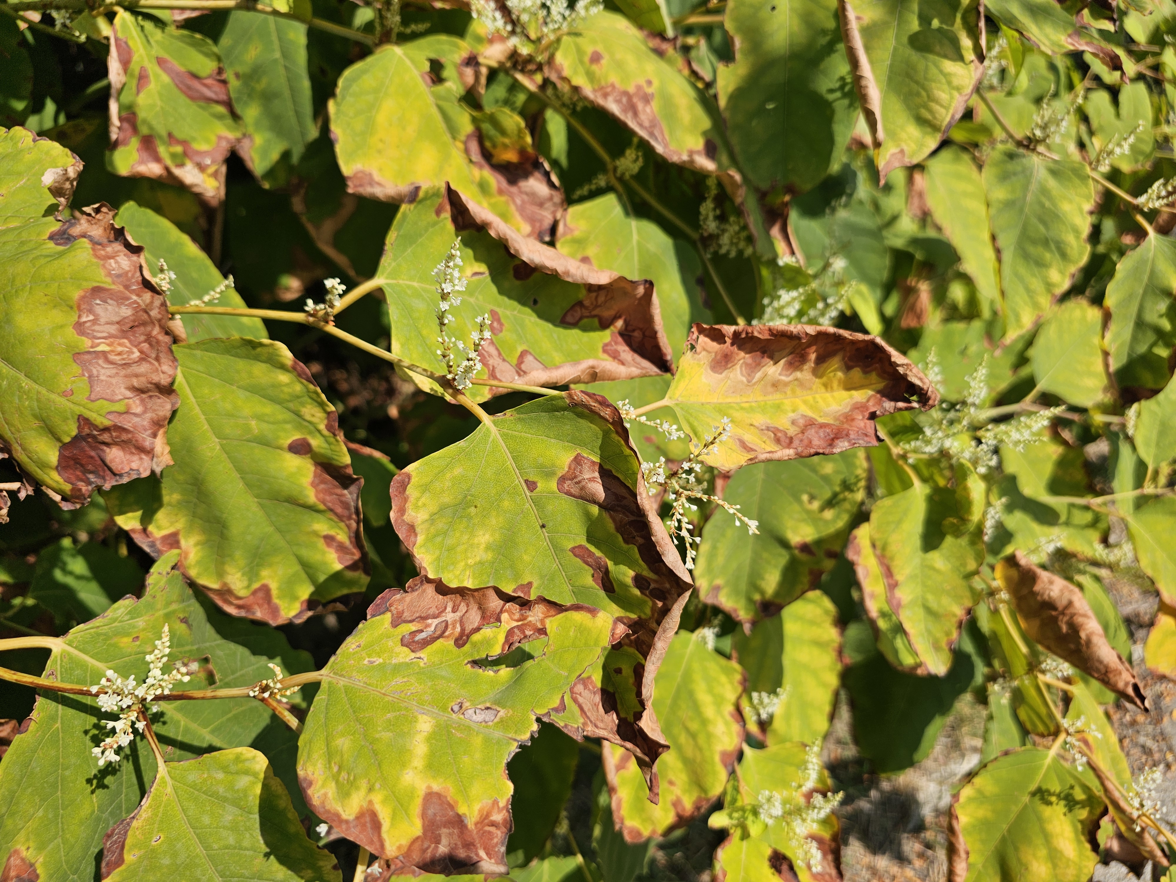 Továbbra is a hőség és a szárazság nehezíti a növényeink életét. Hullanak az almák, a melegtől megfő, barnul a szilva húsa a mag körül és már az invazív, mindenhol vadul terjedő japán keserűfűnek is perzselődik a levele, ahogyan az az augusztus 28-án készült fotón is látszik. Talán hétfőtől változik a helyzet.