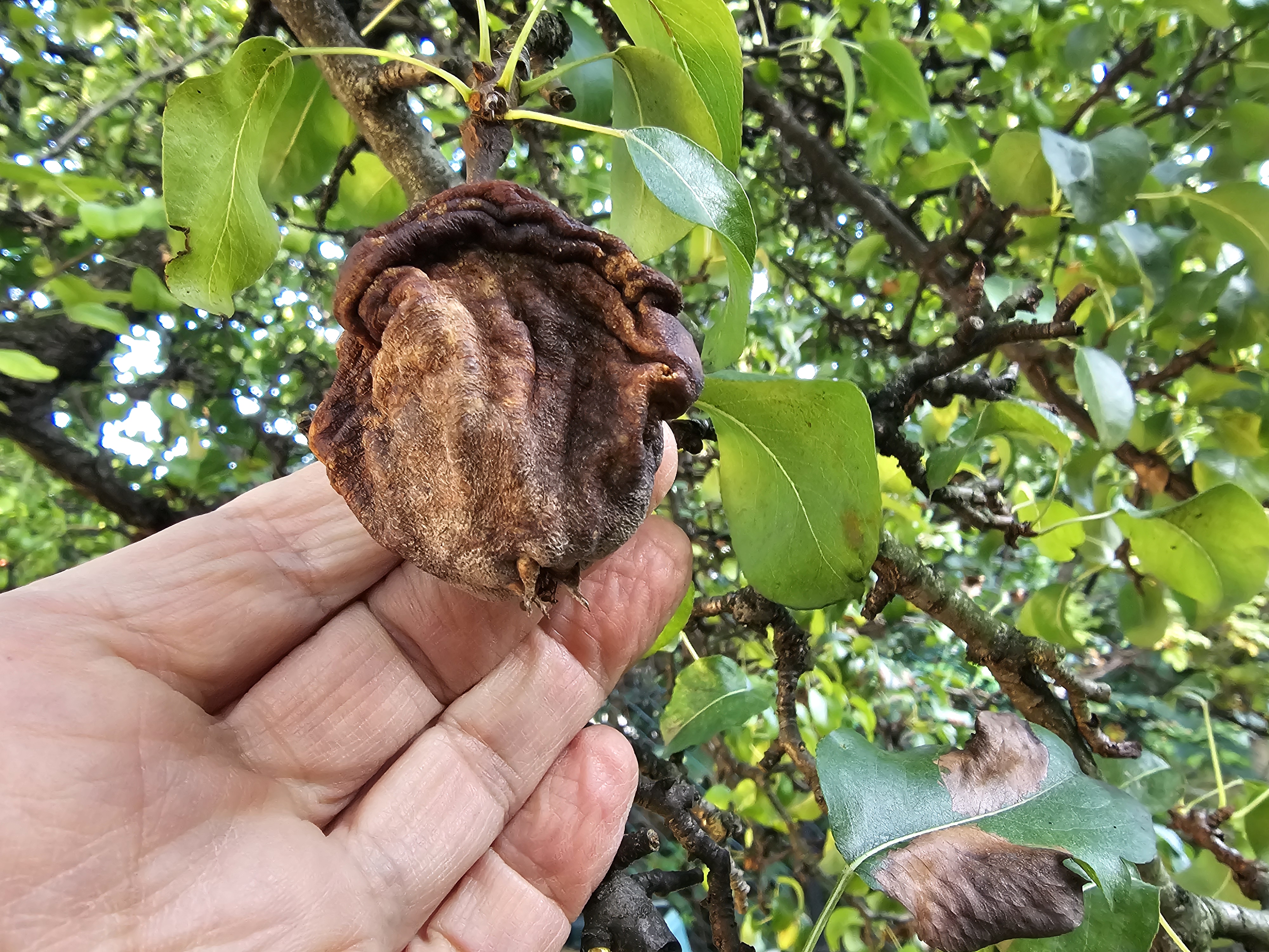 Úgy gondolom, hogy a monília miatt a legtöbb házikertben már nem veszik fel a permetezőgépet. A tavaszi fertőzés a fán maradó, gyümölcsmúmiává alakuló beteg termésekről indul, ezért a beteg gyümölcsöket is szedjék le és távolítsák el a kertből! Már megindult a múmiává alakulás folyamata. Az alábbi fotó szeptember 25-én készült.