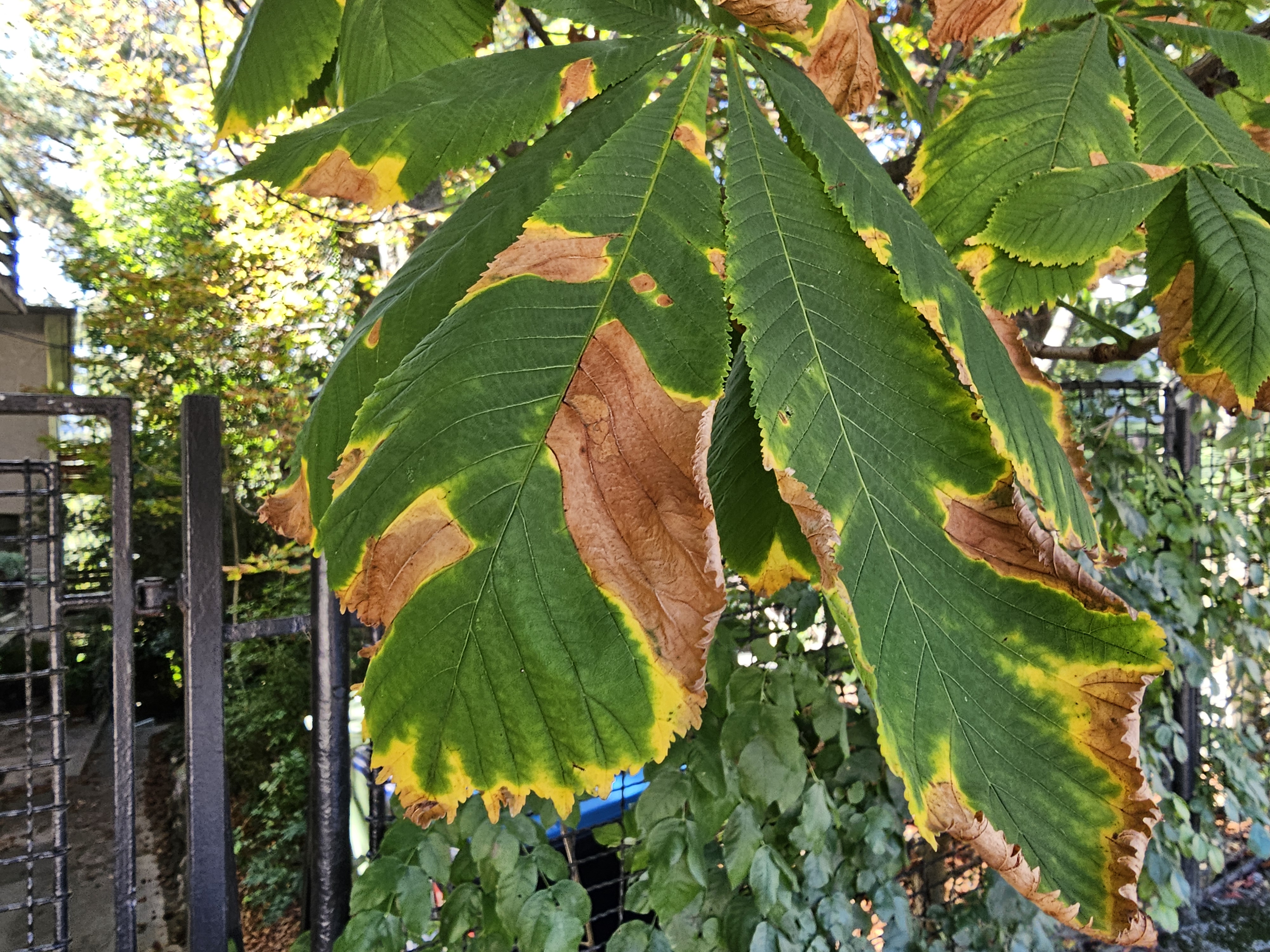 A vadgesztenyelevél-aknázómoly harmadik nemzedéke a lehullott levelekben telel át. Most a fertőzött lomb összeszedésével és eltávolításával csökkenthetjük a moly és pl. a guignardia gomba tavaszi induló fertőzését is. Szeptember 22-én valószínűleg a guignardia gomba tünetét fotóztam le.