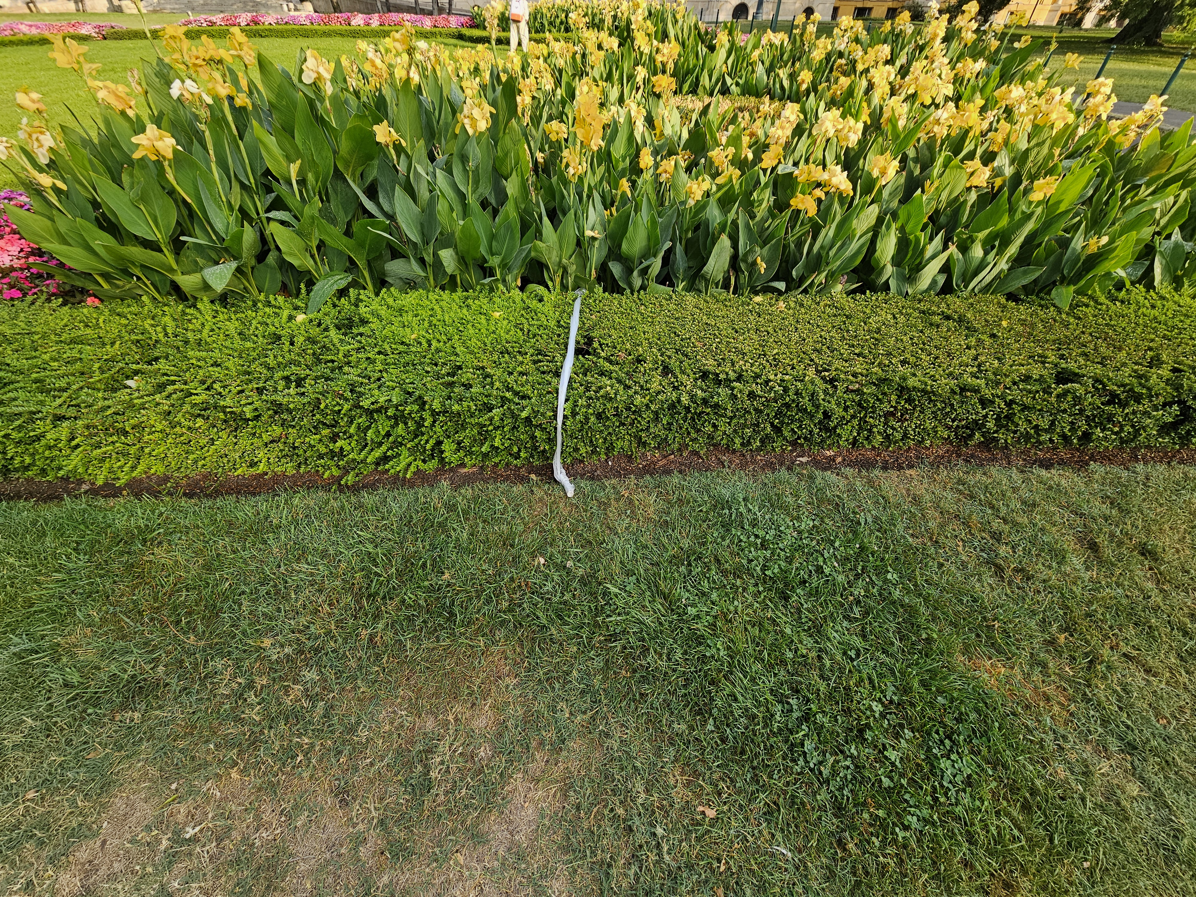 Ahol még egyáltalán maradt buxus a házaknál, a temetőkben, ott a kis hernyók megjelenése után még permetezést javaslok. A bokrok belsejében találják meg a kezdetben kb. 1 cm-es lárvákat, ide kell befújni a rovarölős permetlevet is. Az igazi megoldás a növénycsere lehet. A fényképen a többször permetezett buxussövénytől (a jelölő csíktól) balra egy permetezetlen terülő mirtuszloncot láthatnak. Egészséges a sövény! Kérdezzék a faiskolásokat a pótlásra ajánlott fajokról!