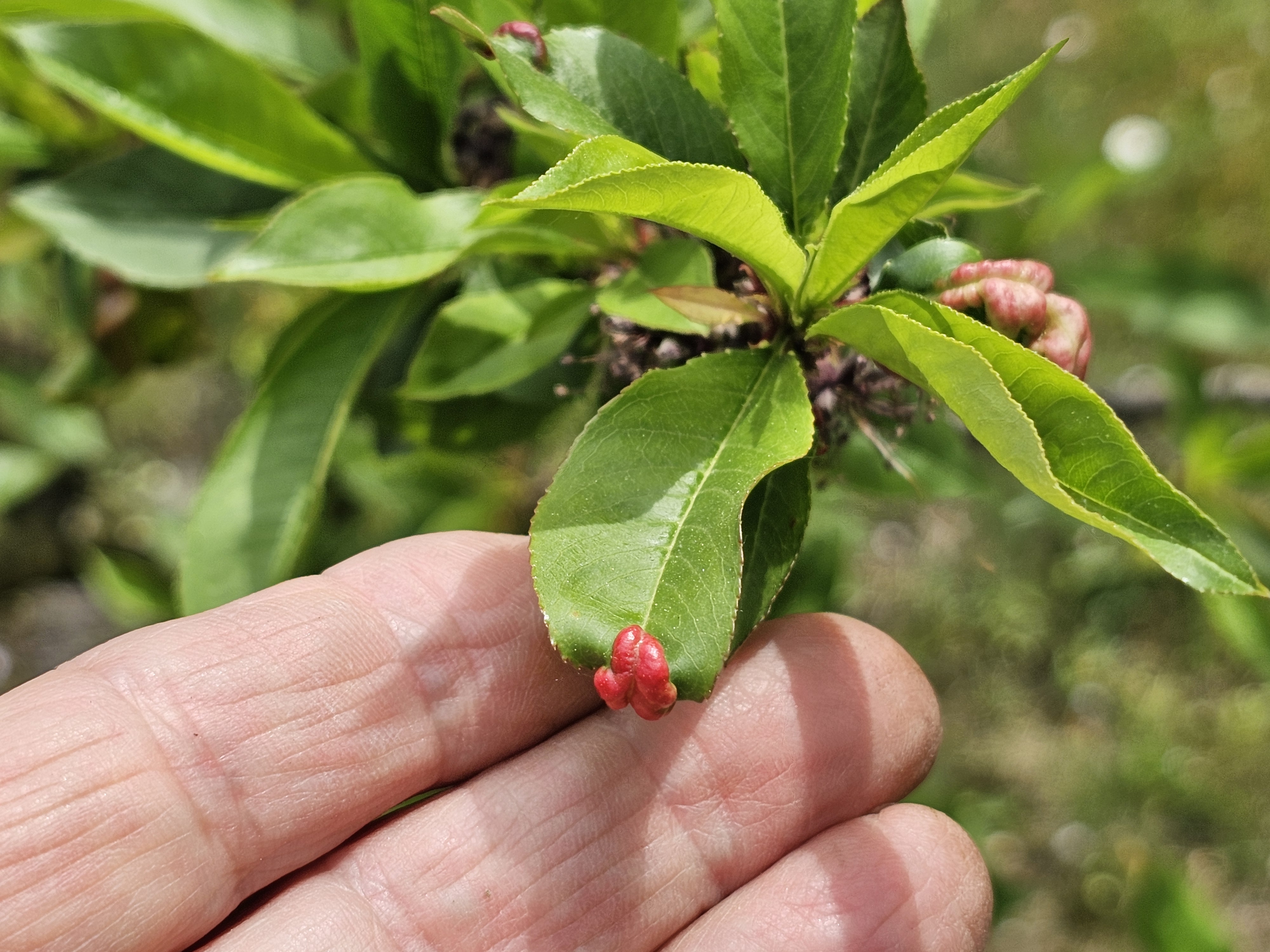 Az április 10-én fotózott őszibarackot sem permetezték; minden levele fodros, torzult volt a tafrinától. Egy nemrég kibújt fiatal levelén látható friss tünet azt bizonyítja, hogy még nem múlt el a veszély! (Lásd az 5. felhívást!)