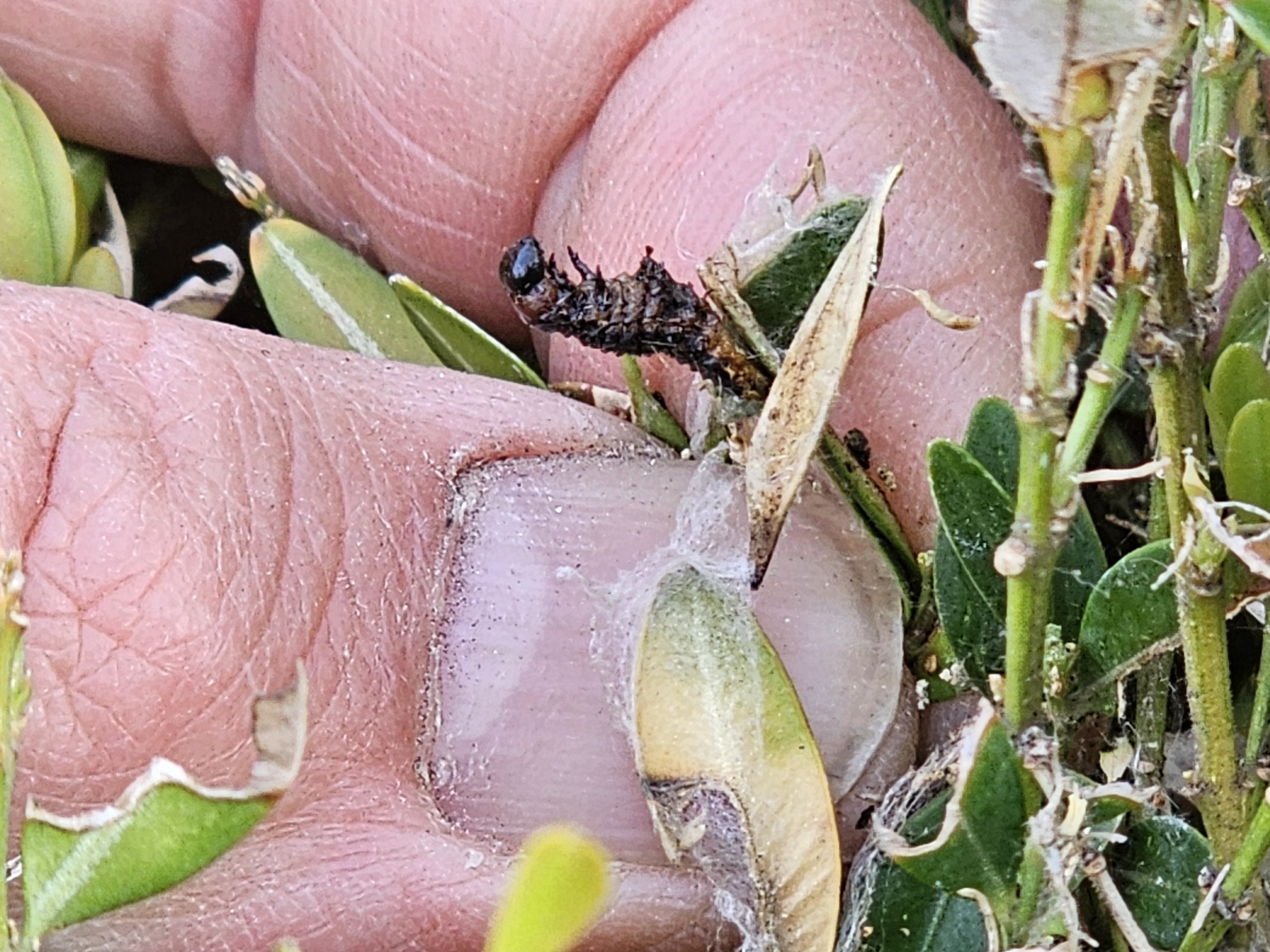 Óbudán március 28-án találtam meg a téli hernyófészkéből kibújó selyemfényű puszpángmoly-hernyót. Nem késlekedtek a permetezéssel, az április 7-én lefényképezett lárva (lásd fent) már nem rágja tovább a buxusbokrot. Ha Önök még nem adták fel a puszpángok megmentését, akkor permetezni kell!Nagy nyomással, a bokrok belsejébe irányítsák a permetlevet. A fiatal hernyók ellen a Dipel DF (Foray 76B, Lepinox Plus stb.), később