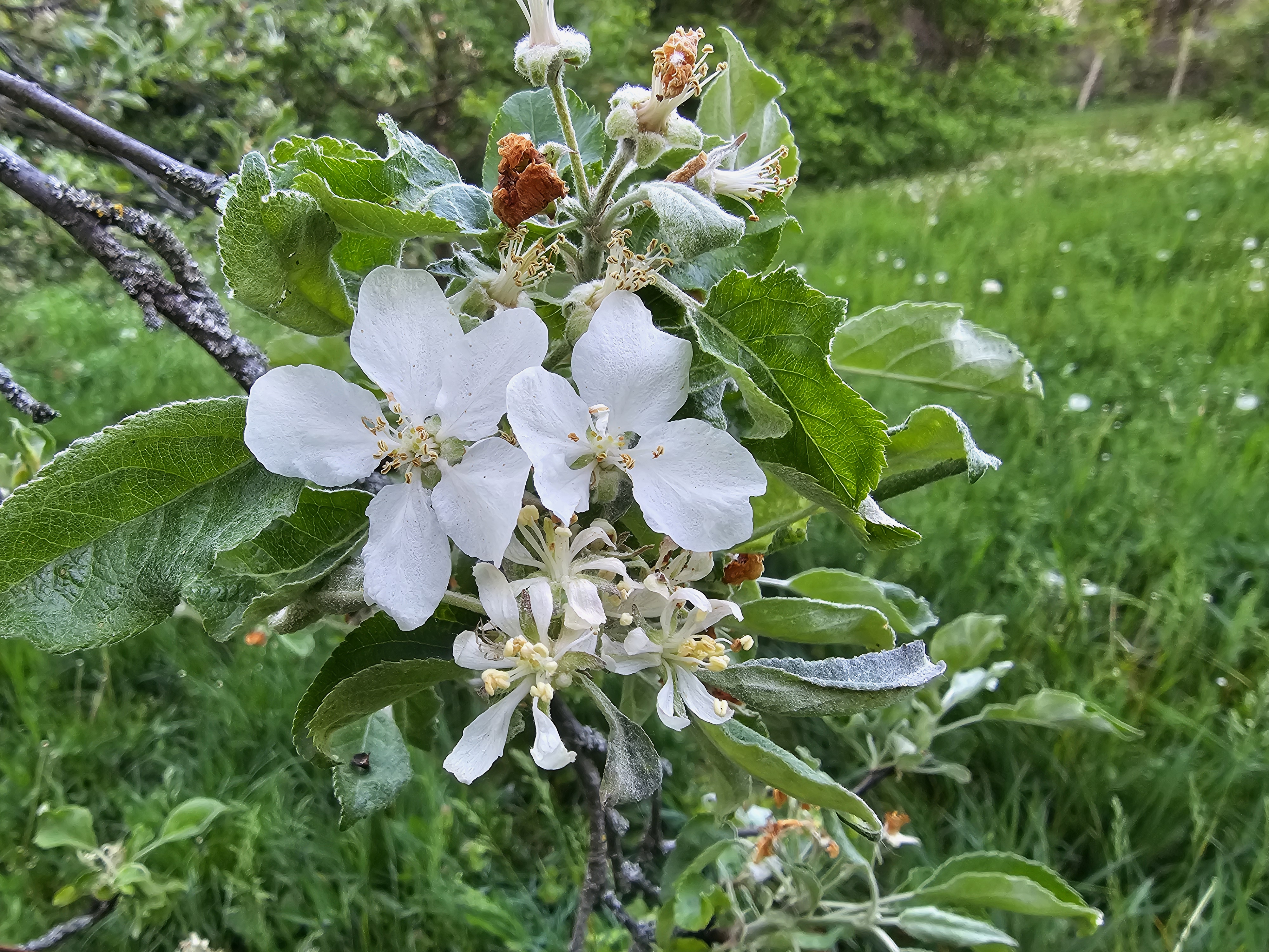 Beteg rügyekből korcs virágok fejlődnek! Az alábbi fotó permetezetlen, lisztharmatos Jonatán almafán készült április 12-én. Nem csökkent a fertőzési nyomás, ismételjék a védekezést a fogékony fajtákon (6. és a 7. felhívás).