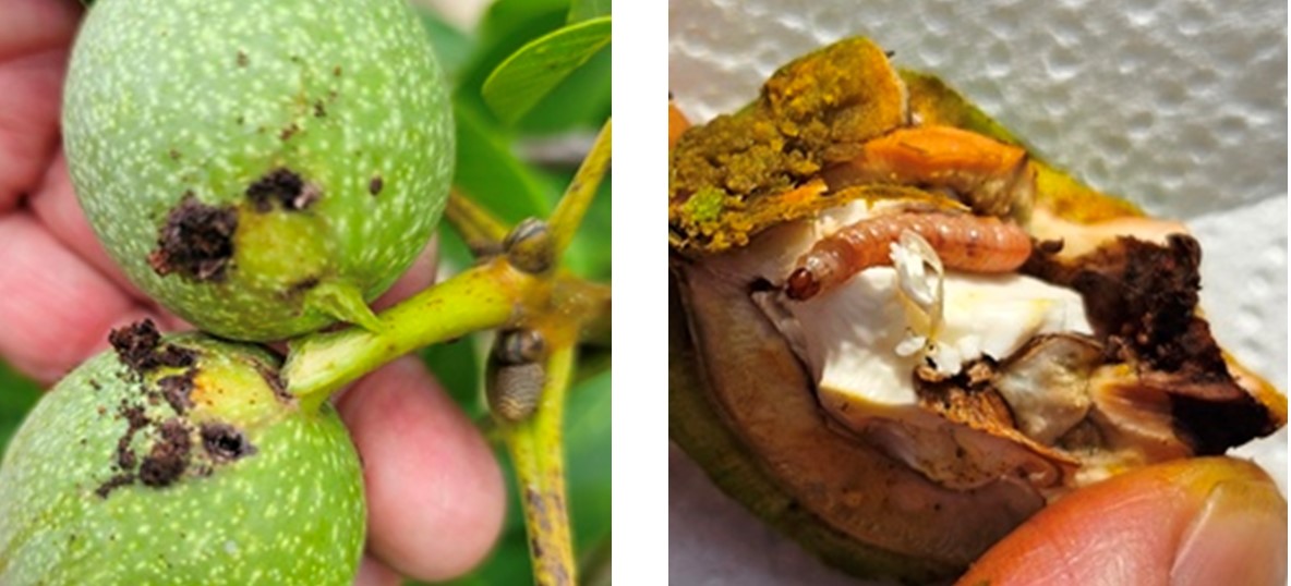 Nem a dióburok-fúrólégy, hanem az almamoly hernyója rág a dióbélben. Két összeérő diószem között hatol be a szemekbe. A fotók augusztus 2-án készültek. A légy lárvája (a nyű) sokkal kisebb, fehér színű, és nem hatol be a termés belsejébe, a burok alatt nyálkásítja el a termést. A moly ellen korábban kellett volna permetezni, az egyre erősebben rajzó dióburok-fúrólégy ellen pedig ismételni kell. Még messze van a termésérés, őszig rajzik és károsít (11. felhívás)!