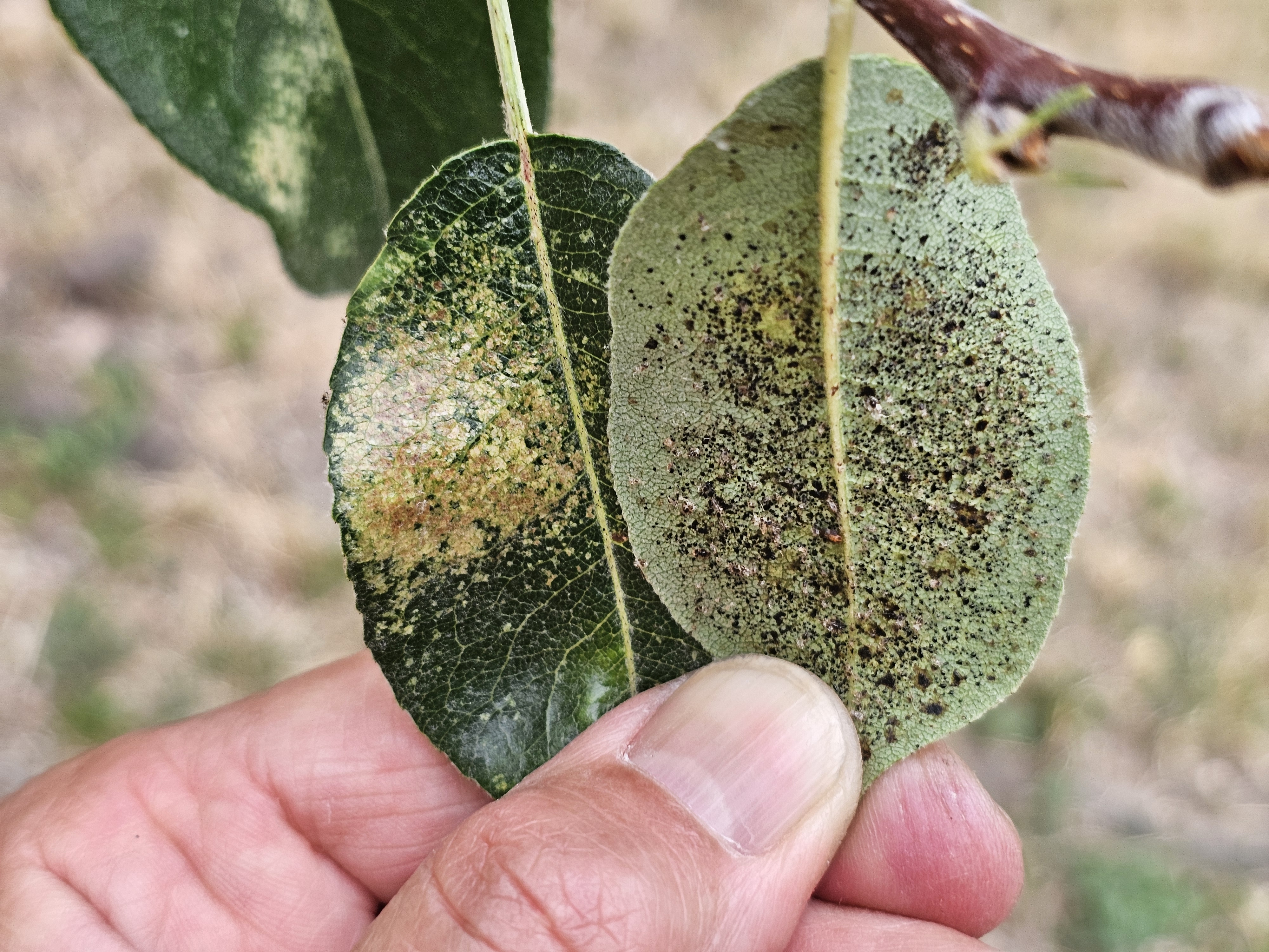 Ritkán látott kártevők is megjelenhetnek pl. a körte csipkéspoloska, amelynek kártételét július 23-án fotóztam. A levél színén a szívásnyomait, a fonákon az ürülékszemcséit láthatják.