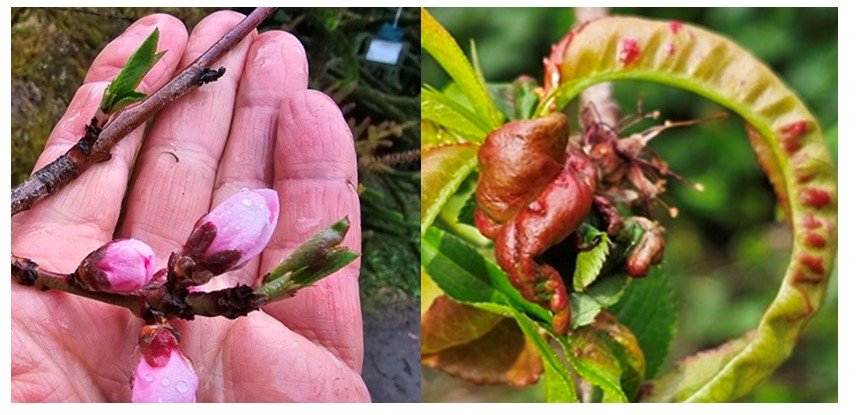Március 25-én Pesten, esőben fényképeztem az alábbi kép bal oldalán látható a nektarin fát, amely tavaly április 2-án már a jobb oldali képen látható fejlettségi állapotban volt. Most a virágfertőző monília mellett (3. felhívás) a tafrina gomba fertőzését is segíti a jelenlegi időjárásunk.