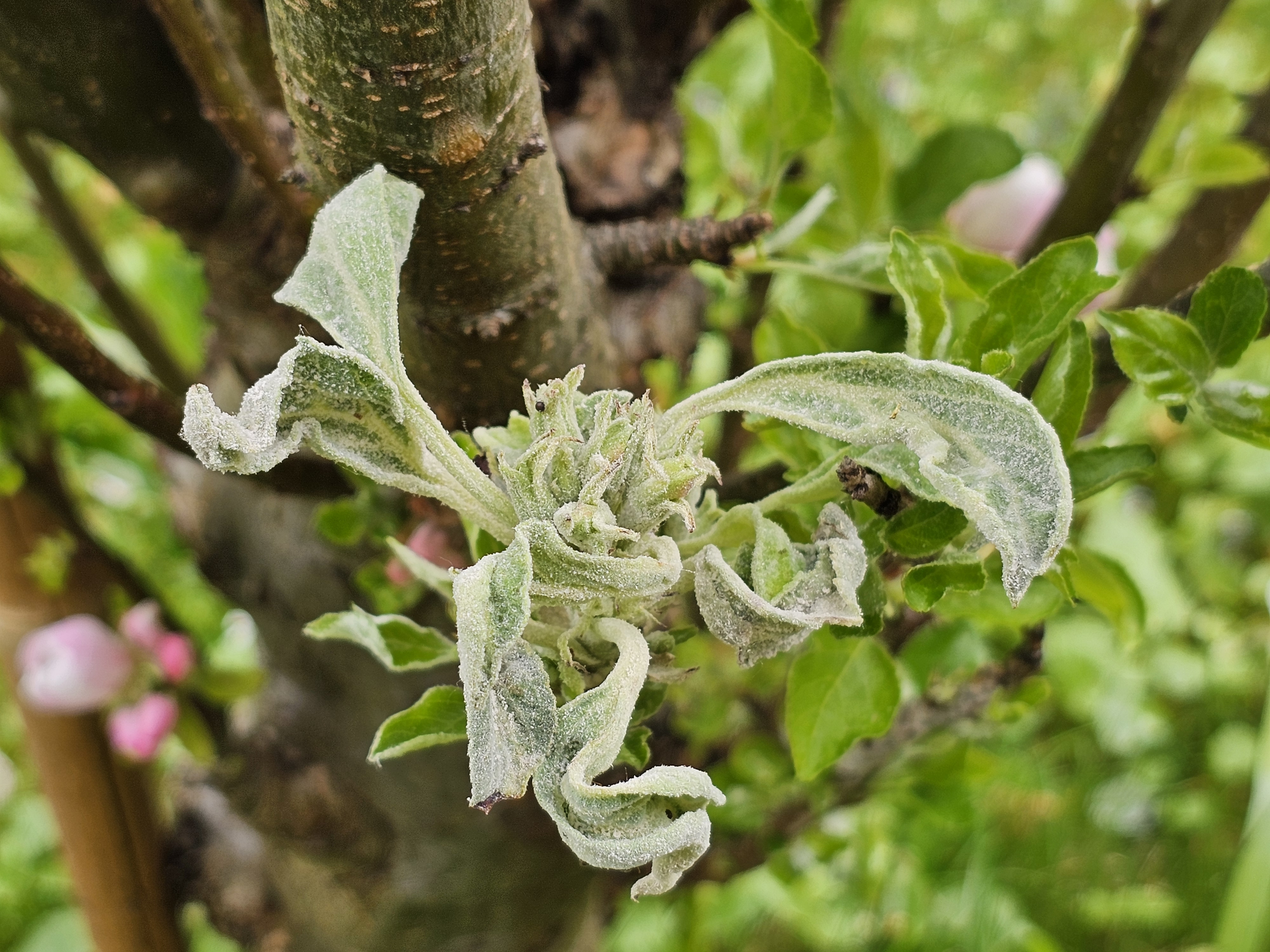 A lisztharmattal is számolnunk kell. A fertőzött rügyekből kipattant torz levelek felületéről, a fehér „lisztes” gombatelepekről máris szóródnak a terjedést biztosító spórák (a konídiumok). A piros bimbós állapotig a kontakt kéntartalmú gombaölők lehetnek a főszereplők. A perzselés elkerülése miatt fontos, hogy egységesen 1-5μ méretűek legyenek a kén szemcsék a gombaölőben. Sok készítmény megfelel ennek a követelménynek: pl. a Thiovit Jet, a Microthiol Special, a Kumulus S, a Flosul, stb. Ez a permetezés is időszerű lett a lisztharmatra érzékeny almafajtákon. Ne engedjük be a lisztharmatot a levelekre, mert azokról terjednek át a gyümölcsökre!