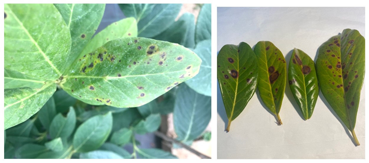 o Levélen: szabálytalan, sötétbarna-fekete, vízáztatta szegélyű foltok, gyakran sárga udvarral.