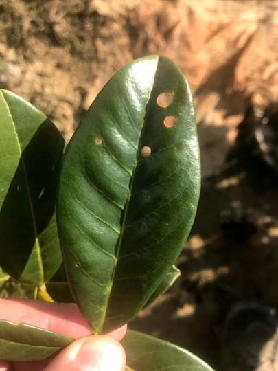 o Levélen apró, vörösesbarna, vízáztatta foltok, amelyekből lyuk keletkezik, mintha apró golyók lőttek volna bele („shot hole” tünet).