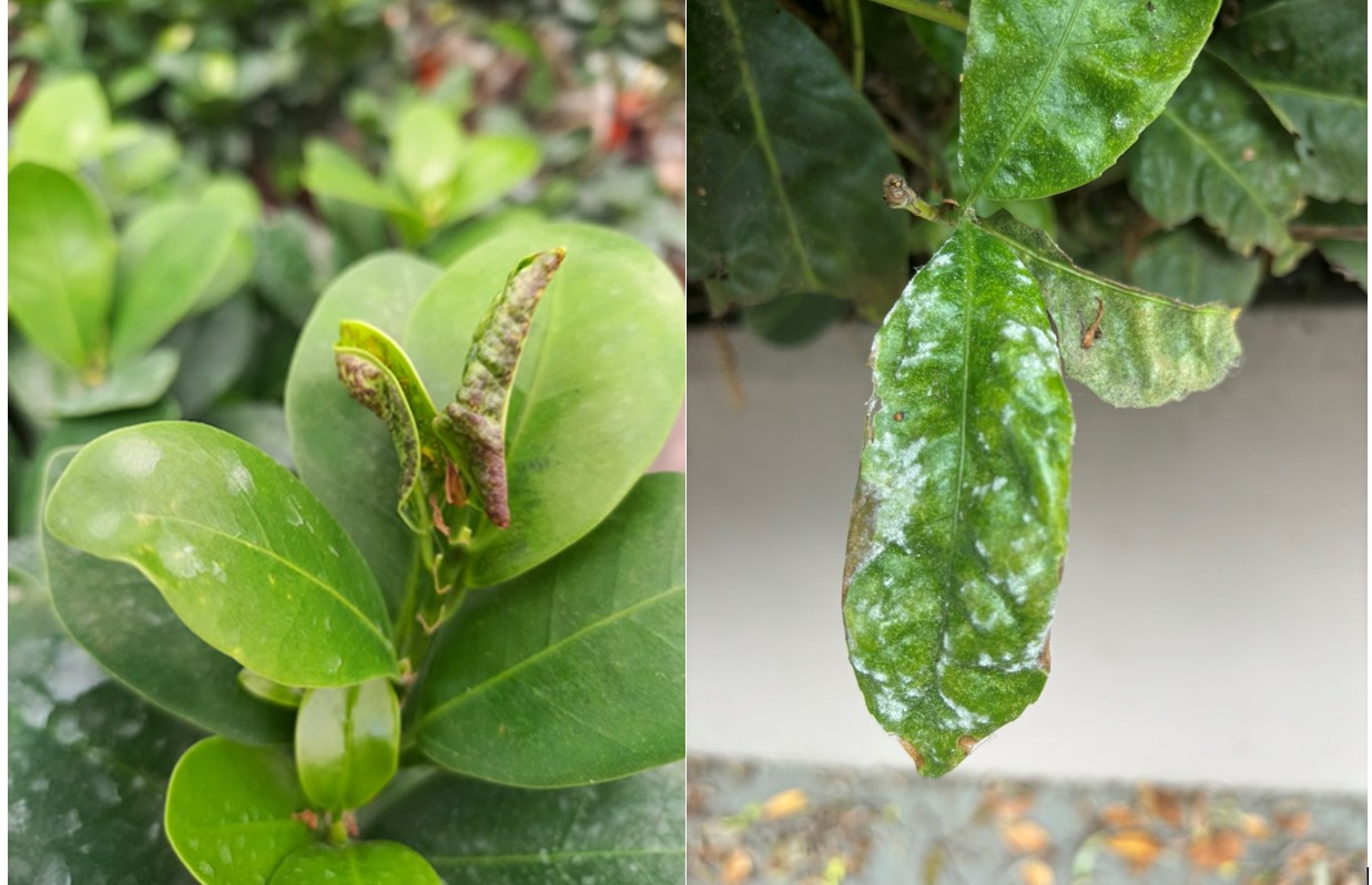 o Fiatal hajtásokon és leveleken fehéres lisztes bevonat.