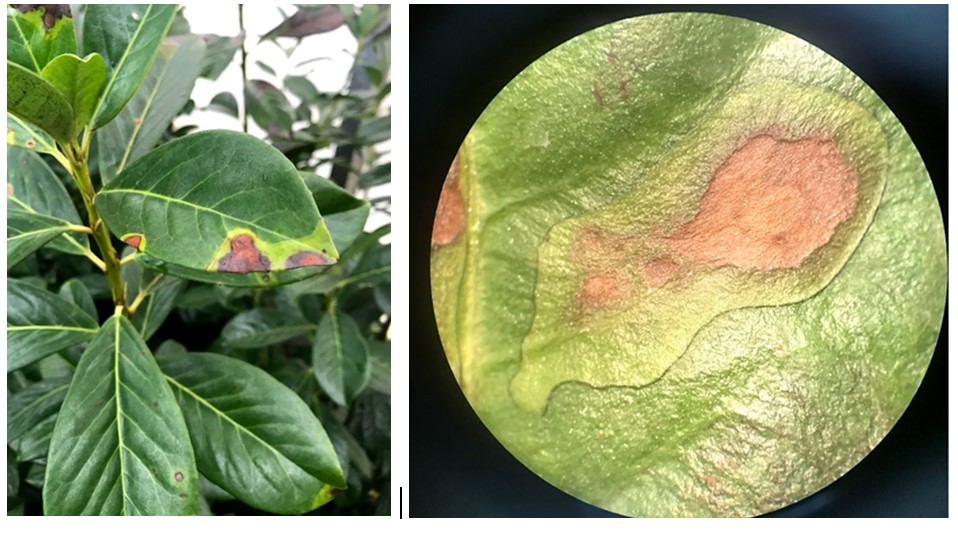 o A cseresznyéhez hasonlóan apró, lilás-vöröses foltok jelennek meg a leveleken, a fonákon fehéres-rózsaszínes spóratartók láthatók.