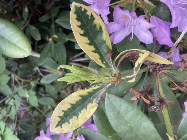 • Tünetek: A virágzása leáll, növekedése lelassul. A felület érdes lesz. Későbbi stádiumban a rododendron levele sötétedik, erősen deformálódik. Megjelenik egy "mozaik" minta.