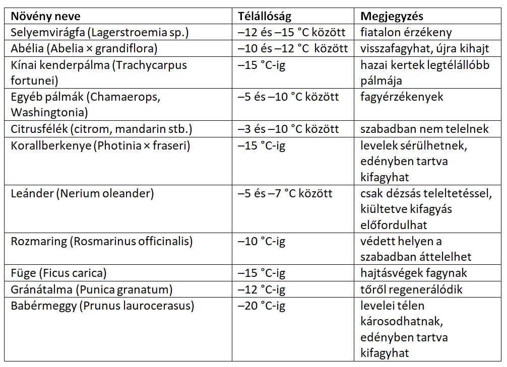 Néhány mediterrán, illetve mediterrán jellegű növény télállósága