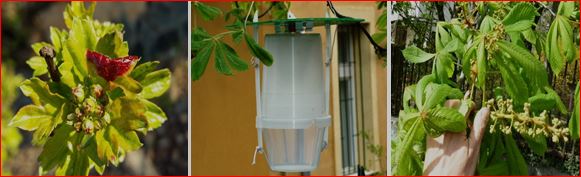 Az idei év nagy újdonsága, hogy feromoncsapdával is megfigyelhetjük a későbbi betelepedését. A Magyar Tudományos Akadémia Növényvédelmi Intézete által kifejlesztett csapdát megtekinthetik és megrendelhetik a http://www.csalomoncsapdak.hu oldalon. A csapdatípus (VARL) megegyezik a középső fotón látható vadgesztenyelevél-aknázómolynál használt csapdával. (Érdemes körülnézni az oldalon! Sok egyéb, a közterületi dísznövényeket is károsító rovar nevével találkozhatnak a felsorolásban. Ilyenek pl. az egynyáriak virágbimbójában rágó gyapottok bagolylepke, vagy a mézharmattermelő levéltetvek.)