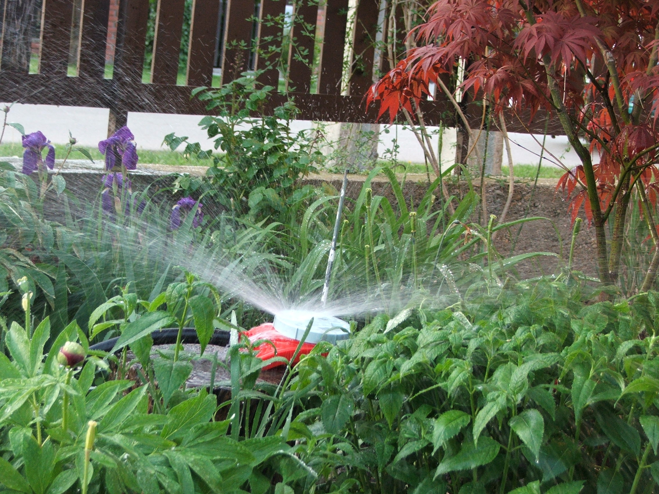 A veteményes és díszkertet is víztakarékos módon öntözzük. Az öntözővíz a legjobban a hajnali órákban hasznosul. Ilyenkor a gombabetegségek kialakulásának veszélye is kisebb. Furcsán hangzik, de esőben is érdemes beindítani az öntözést, mert sokkal kisebb a párolgás, több víz jut el a növények gyökeréhez. Fontos, hogy a növény tövét öntözzük, akár csepegtető vagy szivárogtató (izzadó) csöveken keresztül juttatjuk ki a vizet, akár öntözőkannával.