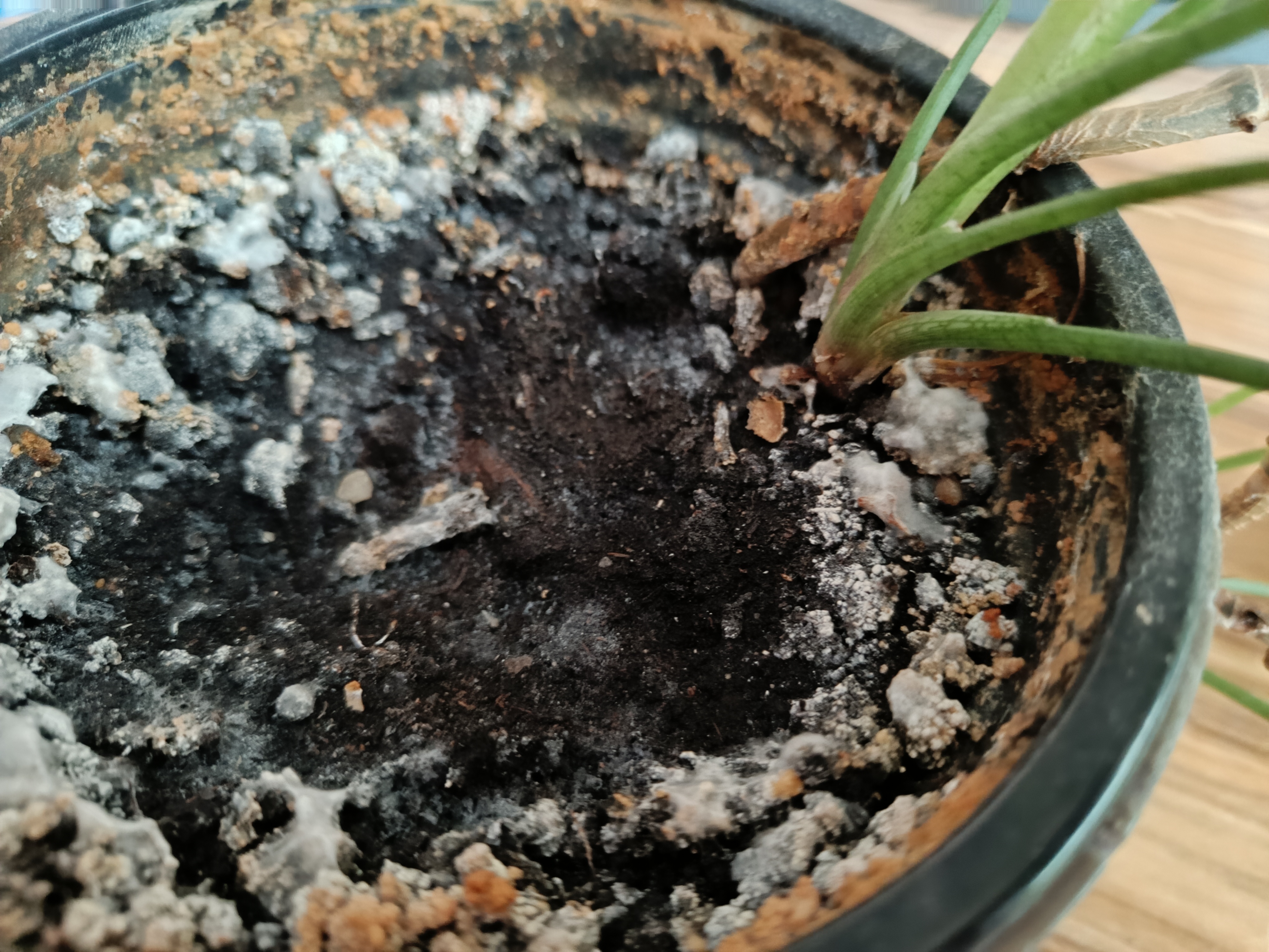 Ez sófelhalmozódás jele. Kaparjuk le a felső réteget, majd mossuk át a földet esővízzel vagy ioncserélt vízzel. Hosszú távon célszerű átültetni a növényt.