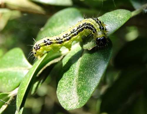 A puszpáng veszedelmes molykártevője, a selyemfényű puszpángmoly hazai megjelenését követően a kártevő mára általánosan elterjedt és a vele kapcsolatos problémák 10 év óta alig enyhültek. Egy-egy bevándorló (inváziós) károsító esetében fejlődési alakjainak, környezeti igényeinek, a felszaporodás okainak tisztázása is fontos annak tudatában, hogy természetes ellenségeit (pl. fürkészek, rablópoloskák, gombák) nem hozza magával. Nemzedékeinek száma 3, vagyis a lepkék háromszor repülnek évente. Az áttelelő kis hernyók már március második felétől aktivizálódnak és falánkságuk egyre nő. Kifejlődve elérhetik a 4 cm-es nagyságot is. Május második felétől repülnek a lepkék, rajzásuk elhúzódó, hetekig tart. A következő lepkerajzásig – június végétől – eltelt időszakban a kár látványos mértékű: védekezés nélkül a lombozat 100%-át is elpusztíthatják. Az utolsó repülés augusztusban történik, és ez is hosszú ideig tart. Az ezután lerakott tojásokból kikelő kis lárvák a maguk által készített szövedékgubóban, a bokrok belsejében telelnek át. A védekezés kritikus ideje a korán előjövő kis hernyók pusztítása. Erre kiválóan alkalmasak a növekedésszabályozók (Runner, Dimilin stb.). A kezelést 10 napon belül ismételni kell. Ezt követően elsősorban a kontakt szerek bevetése hozhat eredményt úgy, hogy erős vízsugárral a bokrok belsejébe irányítjuk a szórófejet. Védekezésre hatásosak a felszívódó rovarölő készítményekkel való kombinációk is (pl. Mospilan+Karate).