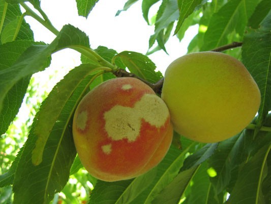 A gyümölcsöskertekben járva ritka betegség tüneteit fedeztem fel őszibarack termésén. Az őszibarack lisztharmata különösen a gyümölcsön súlyos elváltozásokat okoz: a gyümölcs fejletlen, íztelen, gyorsan romló. Felületén kisebb-nagyobb, ki nem emelkedő, okkeres, színű, szemcsésen nemezes folt, illetve foltok keletkeznek (képen). A piros héjú fajtákon az ilyen foltokat piros gyűrű is övezheti. Egyéb, a hajtásokra és levelekre jellemző tüneteket – a levelek piszkos fehéres-rózsaszínes elszíneződését, csónakosan görbült száradását és levélhullást, valamint a hajtásvég lisztességét és a rügyek beszáradását – szinte nem is lehetett látni. Mivel a kén a lisztharmat mindenkori ellenszere, rügypattanásig a lemosó keneket, később a nedvesítő kenek (Thiovit, Kumulus, Cosavet, Microthiol Special stb.)használatát javaslom. A fertőzött gyümölcsöket – amennyire lehetséges – célszerű eltávolítani. Egyes fajták különösen érzékenyek a lisztharmatfertőzéssel szemben.