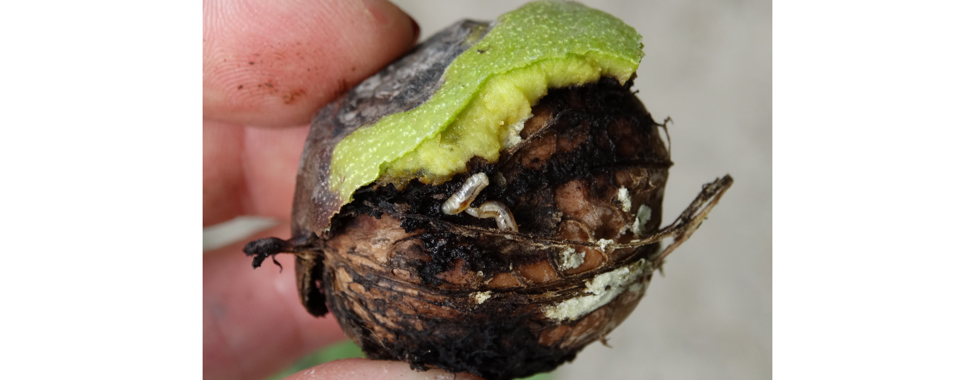 Sajnos, a rajzás hosszan tart, akár 25-40 napig is elhúzódik, és az egy dióburokba helyezett tojások száma elérheti a 300-400 db-ot. A belőlük kikelő lárvák száma akár 20 is lehet. A lárvakártételt követően lehullott fekete diókat naponta össze kell szedni és eltávolítani a talajon hagyott fóliáról.