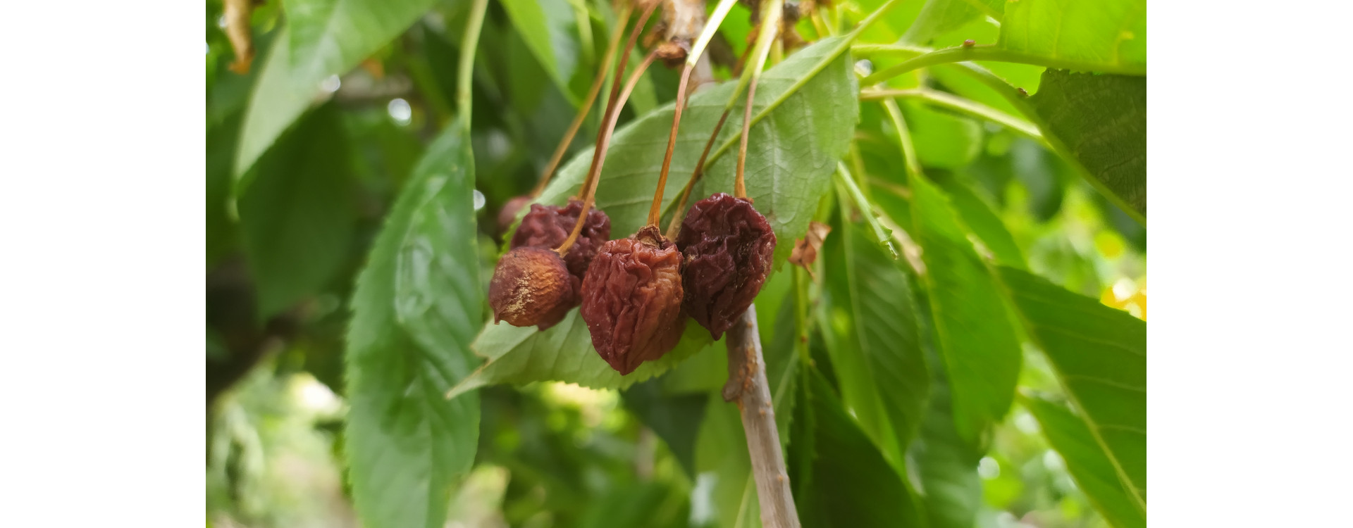 A rettegett monília tavaszi megjelenése során a gomba erőtlenségét tapasztalhattuk. A hajtásvégek elhalása, a virágos ágak barnulása, száradása az előző évieknél jóval kisebb mértéket mutatott. A későbbiekben a száraz, forró időszak nem kedvezett a kórokozónak, fentiekben jelzett tünetei sem fokozódtak. Az érés idején azonban a három gyakori moníliafaj közül a mintegy 15 éve nálunk is megjelent a M. fructicola a cseresznyefákon erős fertőzéssel lepett meg minden kertészkedőt. A késő tavaszi fagyokat átvészelt cseresznyefák szépen fejlődtek, a moníliás tünetek alacsony értékeket mutattak. A gyümölcsérés idején megfordult a helyzet. A termésen apró, drapp, puha foltokat láthattunk, helyenként közel 100 %- mértékben Azután a foltok gyorsan növekedtek és teljes érésben a szemek teljes felületére kiterjedt a drapp elszíneződés. A kedvezőtlen időjárás miatt a foltokon a penészpárnák egyelőre még nem jelentek meg. A jelentős mértékű fertőzés okát elsősorban abban látjuk, hogy az élelmezés-egészségügyi várakozási idők betartására ügyelő kertészkedők az általánosan előírt 14 napon túl sem permeteztek, hiszen a friss – akár a fa alatt állva csipegető – fogyasztás erre ösztönözte őket. A kórokozó viszont teljes energiáját bevetette.
