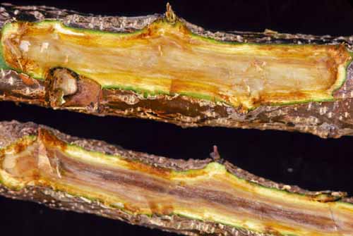A törzs és a vázágak betegségei között gyakoriak a baktériumos fertőzések. A kórokozó légzőnyílásokon, paraszemölcsökön, levélnyél-alapokon hatol be a kéreg osztódószövetébe. A vesszők, ágak megvastagodnak, majd hosszanti irányban felrepednek. A sejtek elhalnak, a sebgyógyulást a baktérium megakadályozza. Ezért kráterszerű, évről-évre mélyülő rákos sebek (pl. Pseudomonas, Erwinia fajok esetében) keletkeznek (2. kép).