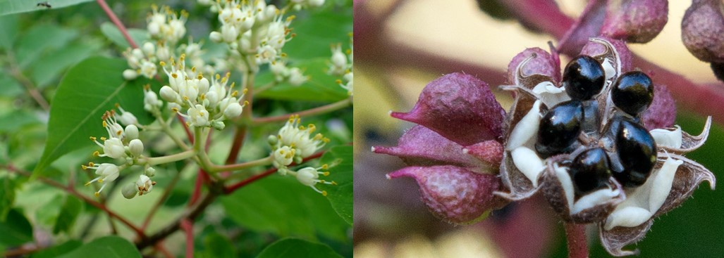 A hétfiúvirágcserje a szirmok lehullása után a bíborvörös/lilás csészelevelek hetekig, akár novemberig is díszítenek. A kései végzetfa virágzás után élénkpiros, csillag alakú csészelevelek közepén ülő, fényes, tintakék bogyószerű termések adnak lenyűgöző színkontrasztot.