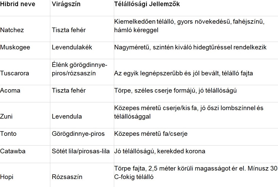 A leginkább télálló Lagerstroemia-hibridek általában azok, amelyeket a Lagerstroemia indica és a hidegtűrőbb, lisztharmatra kevésbé fogékony Lagerstroemia fauriei keresztezésével hoztak létre. Ezek a hibridek nagyrészt az amerikai National Arboretum 1980-as években indult nemesítési programjából származnak, és az amerikai őslakos törzsek nevét viselik. Ezek a fajták a USDA 6-7. zónájáig, (ami a kontinentális éghajlaton igen hidegnek számít) bizonyították télállóságukat.