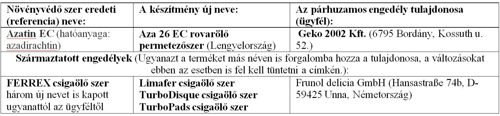 Tazer 250 SC gombaölő permetezőszer engedélye módosult, a régi címkével legkésőbb 2025. szeptember 1. napjáig forgalmazható.