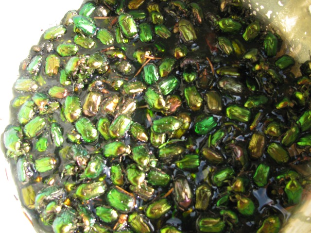 ► Pandúr Ferenc kertbarát évek óta küzd az aranyos rózsabogárral. Befurakodásukkal, rágásukkal 100%-os kárt is okoztak már az érésben lévő gyümölcseiben. Amint a harmadik fotó is bizonyítja, a szomszédja már most is több mint százat szedett le a fenyőjéről. Sajnos egyetlen permetezéssel nem lehet távol tartani őket, folyamatos a betelepedésük. Gyakran augusztusig is eltart a rajzásuk, tájékoztatott dr. Pénzes Béla. Állandóan résen kell lenni! Jól tette, hogy Csalomon csapdát vásárolt. Ezzel elcsípheti a betelepedésüket, időben permetezhet ellenük.