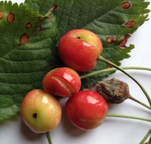 A gombák, a lisztharmatok és a csonthéjasok levélbetegségei már a gyümölcsökön is megjelentek, a gyümölcsfertőző moníliával egyetemben. A birs „saját” moníliáját is megtalálta a kolléganőm, már a kis termésen. A védekezésekről már többször írtam. (A lisztharmatos termésű és gubacsatkás levelű körtét és a repedt, gombás, penészgyepes cseresznye-csendéletet a héten fényképeztem. Beteg levélen, beteg szemeket.) Kujániné Olgitól ma kaptam a hírt: szőlőben Szekszárdon megtalálták a peronoszpórát, az ország több helyszínén pedig a még súlyosabbnak ígérkező feketerothadást. Legközelebb erről is írok.
