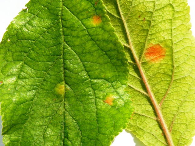 ► Már korábban fotóztam a szilvalevelek vörösfoltosságának a tüneteit. A kezdődő világosabb középső folt mellett a vörösebb, idősebb fertőzés nyomait is láthatják, a baloldali levél szélén és a jobb oldali fonákján. Számos rézkészítmény és a rézpótló mankoceb hatóanyagúak (lásd a 3. felhívást) engedélyezettek ellene.