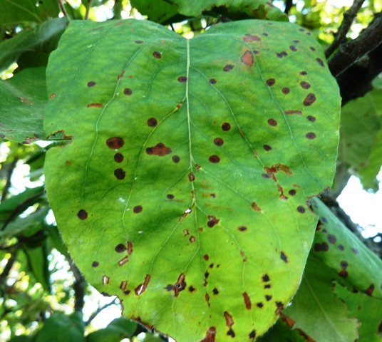 ► Ugyanakkor fényképeztem a birs diplokarponos betegségének kezdődő tüneteit is. Ezt már permetezném, őszig akár teljes lombhullást is okozhat a gomba (réz, mankoceb).