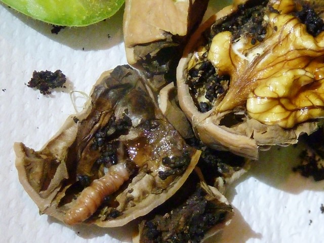 ► Az almamollyal fertőzött diót, még zölddió állapotban, a feromoncsapdák fogásaihoz igazodva kellett volna permetezni. Érdemes felszedni a megfeketedett, könnyű szemeket. Ezekben áttelelhetnek a lárvák! Ez magyarázhatja a népi megfigyelést, miszerint a kertben, a diófák mellett férgesebbek az almák. Hasonlóan fontos a lehullott mogyorószemek összegyűjtése is. A bokor alá terített fólia is bevált. A kimászó lárvákat semmisítsék meg. A lyukas szemekből már a talajba húzódtak! Ekkor már elkéstek! Tavasszal biztosan számolhatnak velük.