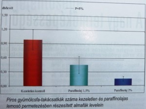 Az almatermésűeknél, szilvánál, szőlőben még a lemosó permetezéssel sem késtek el. A technológiát már ismertettem az első felhívásban. Ismét felhívom a figyelmüket, hogy az idei enyhe telet követő tavaszon, érdemes elvégezni! Dr. Molnár András kísérletében, az olajos lemosás utáni 25. napon számolta össze az életben maradt piros gyümölcsfa-takácsatkákat. Az alábbi grafikon mutatja az eredményeit: a 2% vazelin(parafin)olajos (ld. 1. felhívást) permetezés hatására kb. tizedére csökkent a kártevők száma az almafa levelein.
