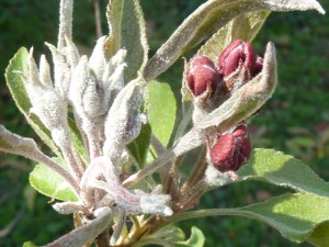 A rügypikkelyek alatt áttelelő lisztharmat viszont már megjelent és több almafajtánál is permetezést kíván. A beteg rügyekből már kibújtak a torz, fehéres bevonatú levélkék és virágbimbók. Ez a primer fertőzés.