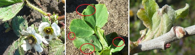►Lisztharmatos (gyertyás) vesszőn, fertőzött rügyből előbújó lisztharmatos almalevélkéket láthatnak az utolsó képen. A metszéssel kellett volna kezdeni... Pirosbimbós állapotig védekezhetünk a kifejezetten lisztharmat elleni kontakt, kéntartalmúakkal. Ahol a varasodással is számolni kell, ott a kontakt rezekkel is ki kell egészíteni a permetlevet. Általában zöldbimbós állapotig használhatjuk a réztartalmúakat, de a finomabb őrlésűekkel és az újabb fejlesztésű molekulákkal bátrabban dolgozhatunk később is. Ilyenek pl. a rézhidroxid illetve a tribázikus-rézszulfát hatóanyagok. (Az összes fotó pénteken készült.)