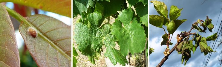 ► A lisztharmatokhoz hasonló környezeti feltételeket kívánnak az atkák, így érthető, hogy az előző években ők is jól érezték magukat. A dió nemezes gubacsatkájának a kárképét 10 napja fotóztam. A gubacsképzők korántsem a legveszélyesebb atkafajok. A szabad szemmel nem látható levélatkák, pl. a szőlőn, fakadáskor sokkal nagyobb károkat okozhatnak, hasonlóan a takácsatkákhoz. A tavaly júliusi képen ugyanazon szőlőfajta levélatkától torzuló és egészséges levelét láthatják. Az atkák soknemzedékűek és egy időben megtalálható a tojás, a lárva és a kifejlett kártevő is. Sajnos az atkaölő szerek többsége nem pusztítja el az összes fejlődési alakot, ezért felváltva használják ezeket! A levéllemezen áthatoló Nissorun 10 WP és a július 31-ig engedélyezett Flumite 200 kivételek, ún. transzlamináris hatásúak, a levéllemezen is áthatolnak.